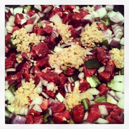 After you’ve chopped the meat, peppers, onion and minced the garlic, add these all to your slow cooker and stir.