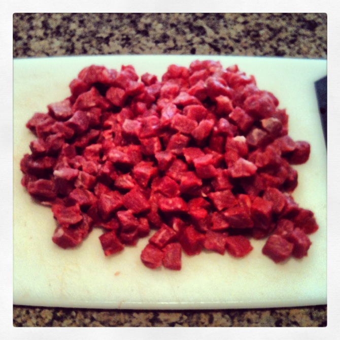 The first step is to cup up the brisket. I like small pieces, between 1/4″ and 1/2″ cubed.