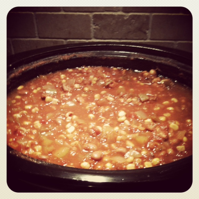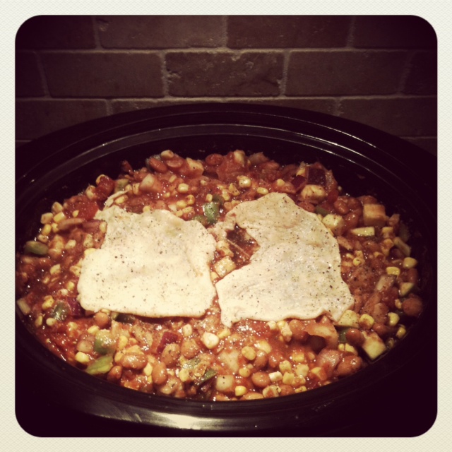 Set the slow cooker to low and cook for 8 hours undisturbed. When the chili is done, pull out the chicken skins and throw them away.