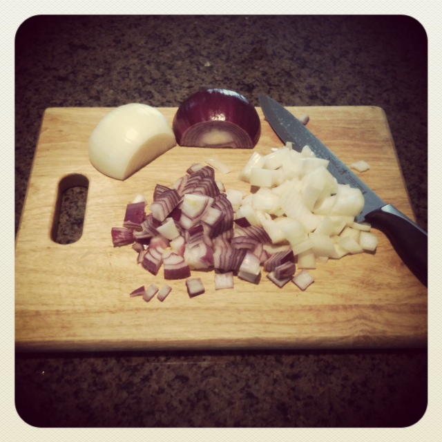 I always like to use two different onions for chili – I think a red and a yellow have a nice balance of flavors, but I’ve used sweet onions in the past as well.