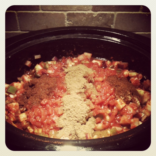 Once you have all your meat and fresh produce in the slow cooker, it’s time to get all the canned goods and spices into the mix. Pour in the crushed tomatoes and give everything a quick stir. It’s easier to stir the chili when there’s less in the slow cooker, and this helps get everything wet and easier to work with. Next, add the diced tomatoes (along with the tomato juice in the can). Drain the corn, but don’t rinse it, and add this as well. Finally, rinse the pinto beans thoroughly and add them to chili.
