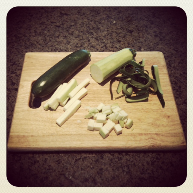 Peel the zucchinis first. Then, I find it easiest to cut them into sticks and make cubes from the sticks.