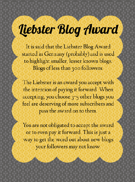 For those who don’t know about this award (I didn’t), the Liebster Award is an award given by small bloggers to small bloggers. It is designed to help increase readership for smaller blogs and build the blogging community. It’s very similar to a chain letter, actually, in that once you receive it, you’re supposed to nominate others and continue to spread the award. Unlike a chain letter, there are no threats of gory deaths or lost crushes if break the chain. I like the idea of the blogging community helping to build up new blogs and increase readers from one blog to another.
