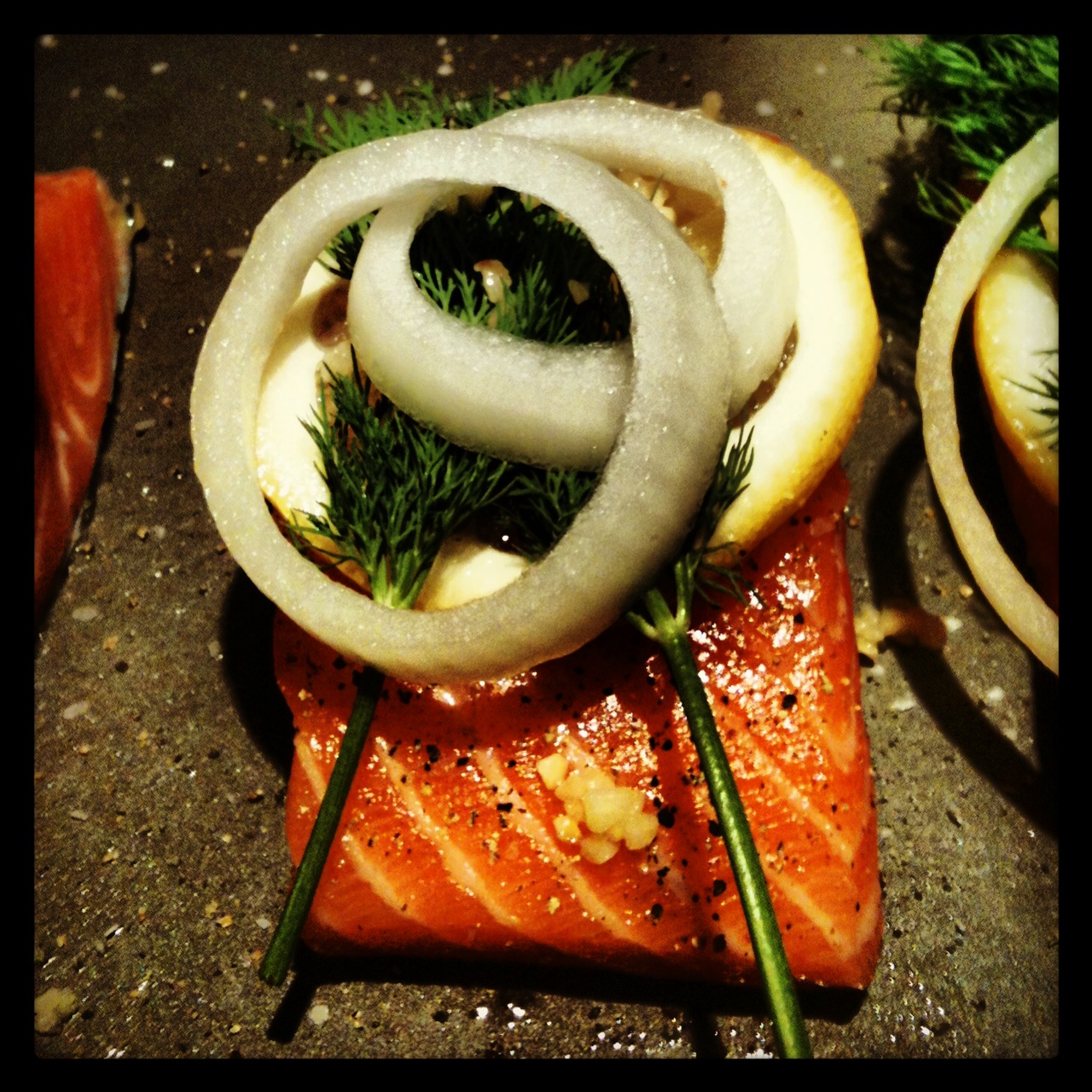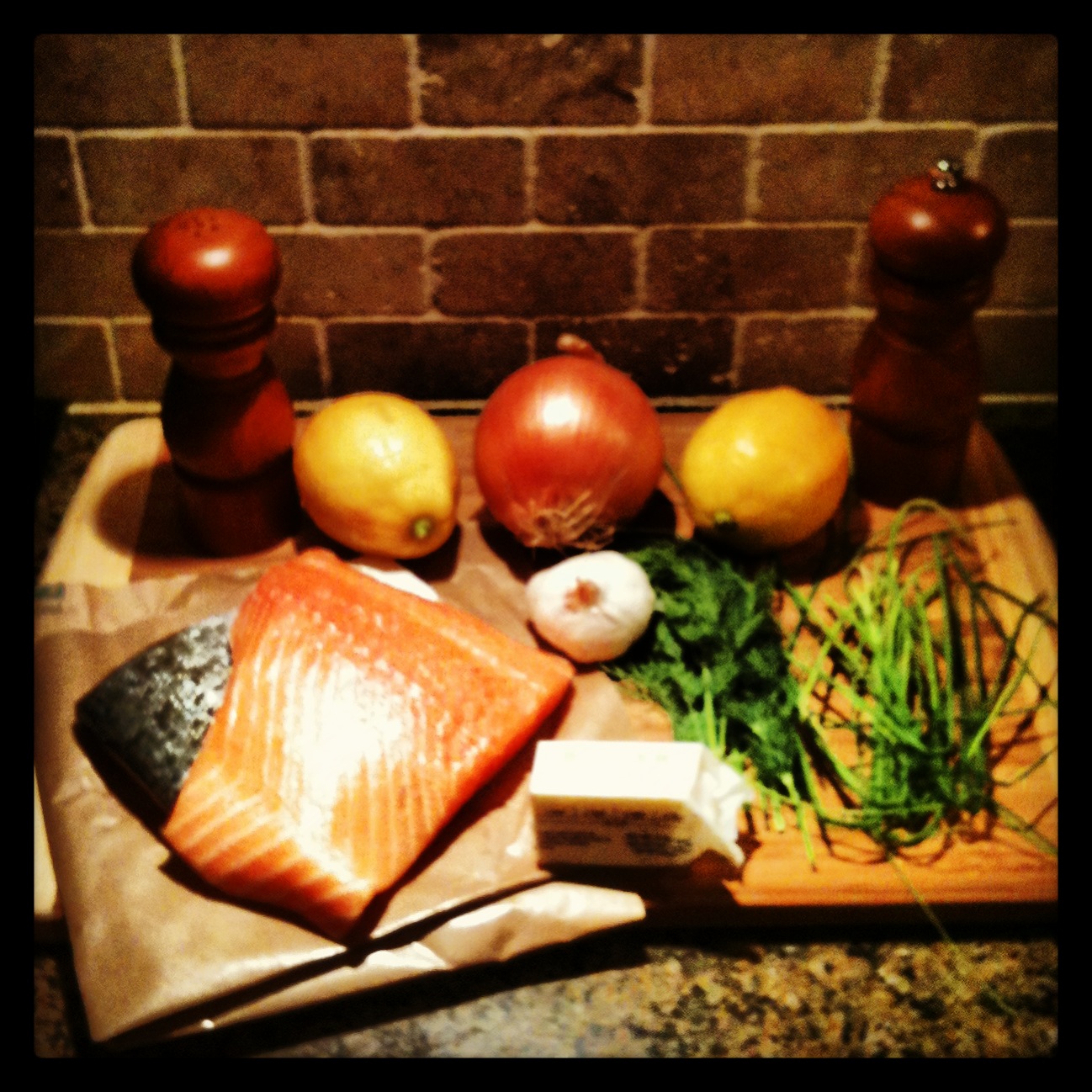 Next, lay a thin lemon slice over the butter. (Be sure to remove the seeds so you’re not fishing them out later.) Lay a few sprigs (is that what they’re called) of dill over the lemon. Place one clove of minced garlic on top of the lemon, and then lay a ring or two of onion over that.