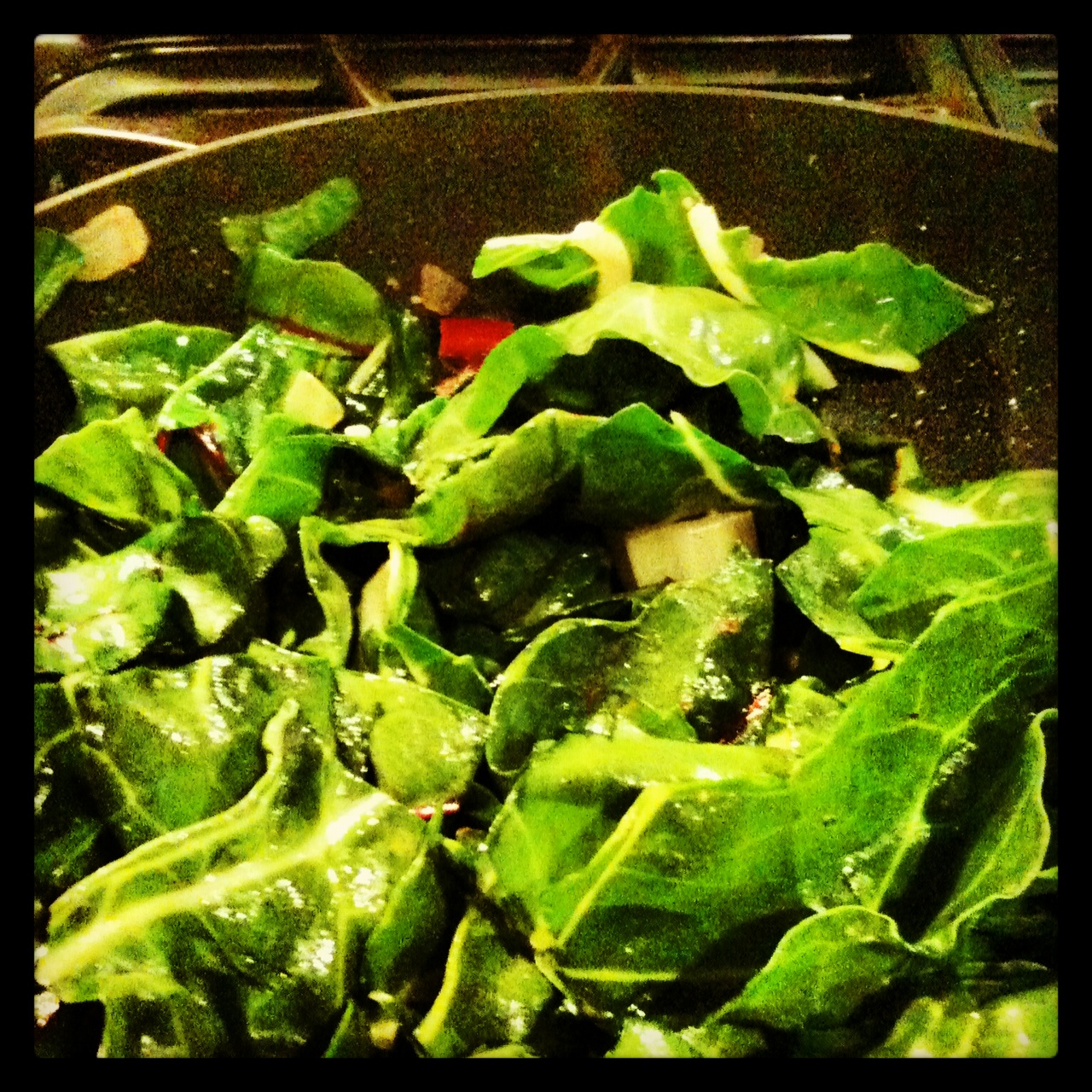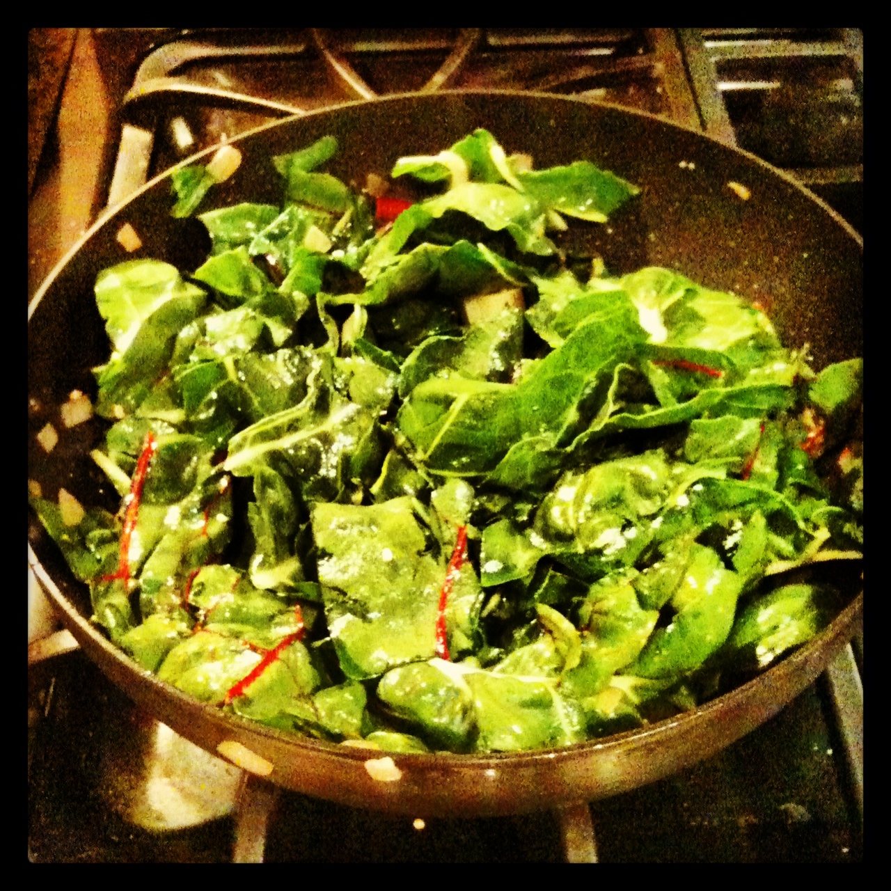Roughly chop the leafy portions of the chard and add them to the pan. Add a little more oil or butter if necessary.