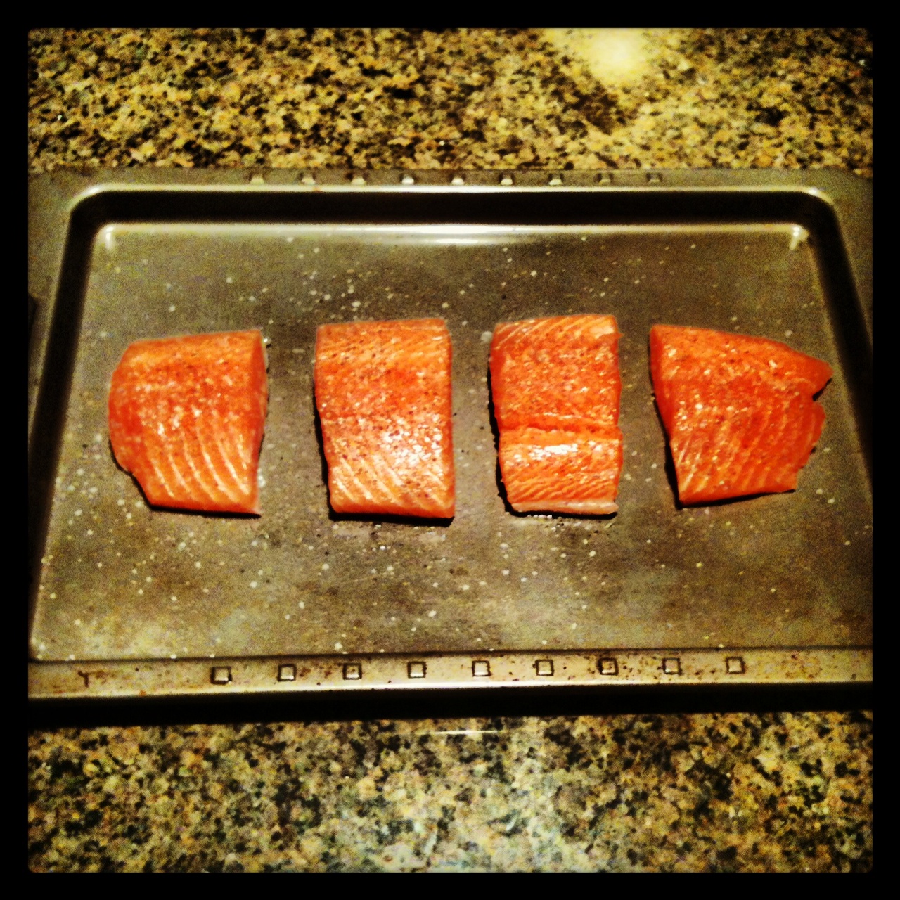 Preheat your oven to 450 degrees. Trim your salmon into 4 roughly equal portions and place them skin side down on a non-stick baking dish. Season with salt and pepper.
