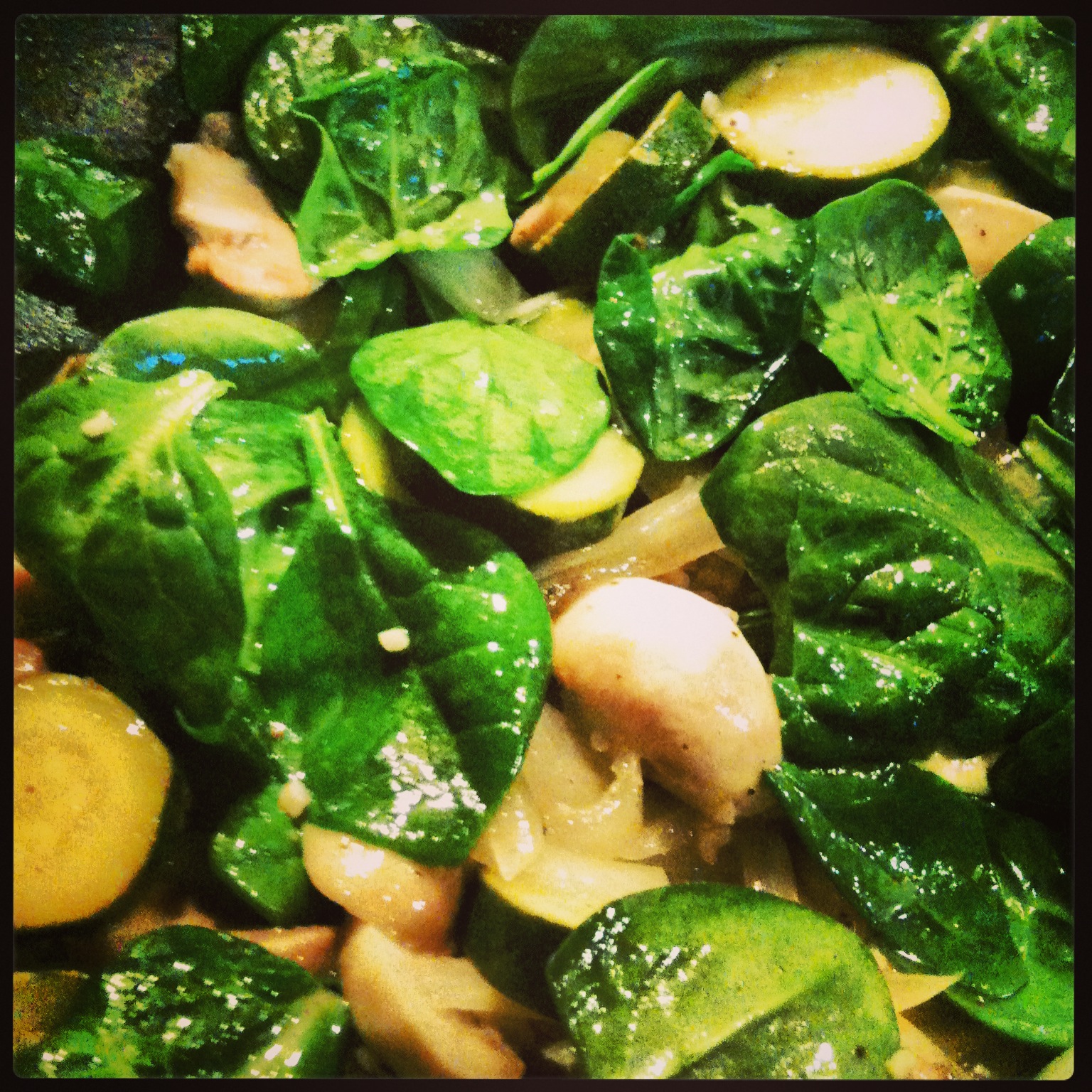 Wash the spinach if necessary, and set aside for now. Heat some extra virgin olive oil with a little butter in your pan (the majority of the butter will be used later). Saute the onion, zucchini and garlic until the onion and zucchini start to soften. Add the mushrooms and season everything with a little salt and pepper (seasoning in layers is important with this dish).