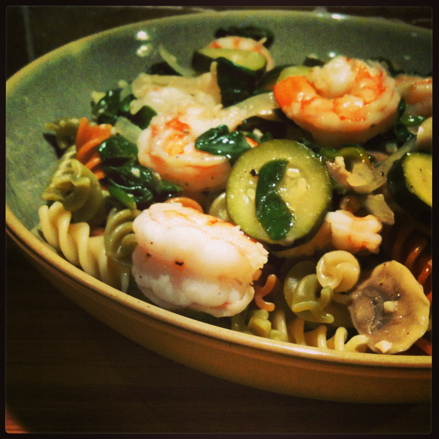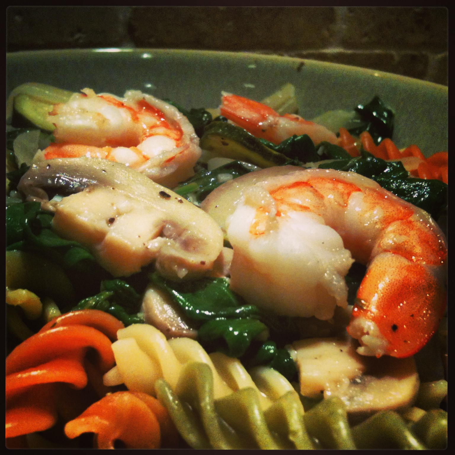 This recipe was Mrs. Eats For All Ages’ idea. I asked her what she wanted for dinner, and she sent me a text message that said, “Can we have pasta with spinach, garlic, butter, mushroom and shrimp? Can Eats For All Ages Junior eat that?”