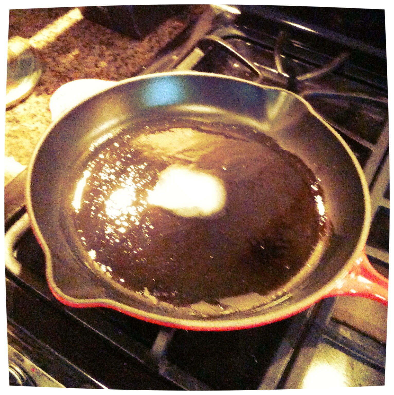 Heat olive oil and butter in a heavy, oven-safe pan over medium high heat.