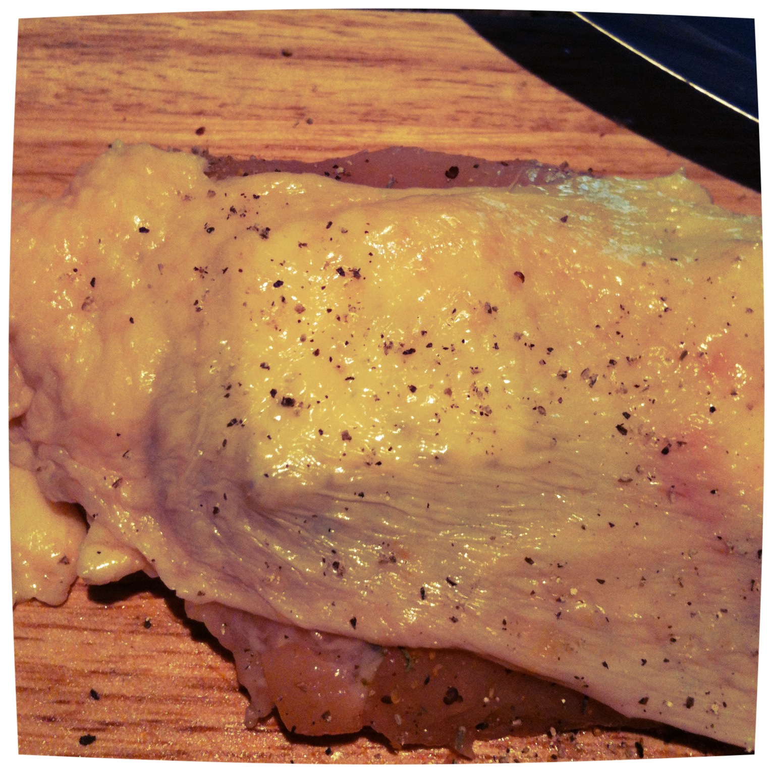 Add a few thin pads of butter to the chicken and cover with the skin. Grind a little more black pepper over the skin. The butter will melt as the chicken cooks, mixing with the chicken fat that renders out of the skin, giving the chicken a rich, delicious flavor.