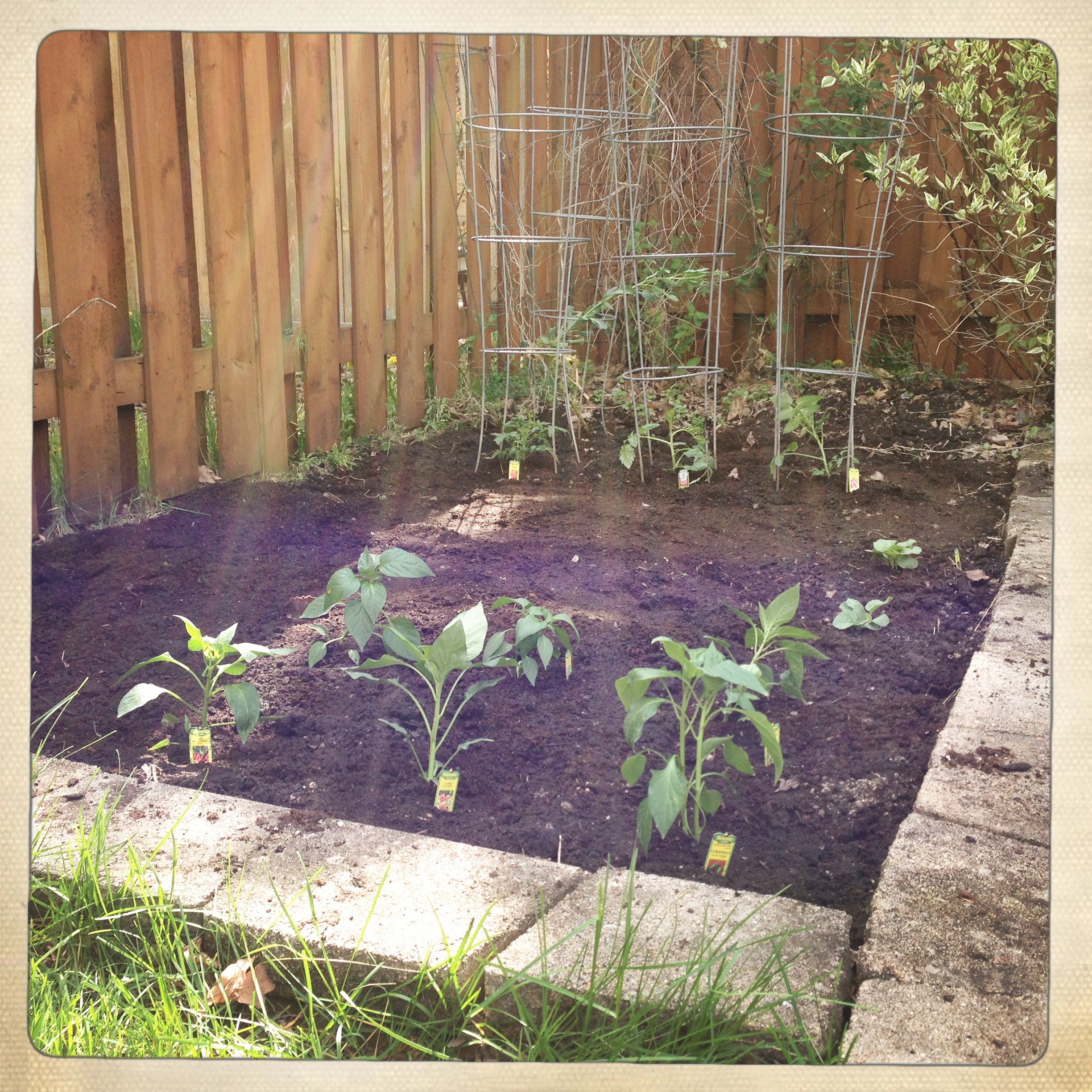 Once everything is laid out and planted, I give the garden a good soaking. I use a porous soaker hose because it gently waters the garden evenly and uses a lot less water than a sprinkler. Most of the plants I grow are pretty hardy and capable of going a few days without water if I get busy, but it’s pretty important to make sure to water everything thoroughly for the first few days while the plants adjust to their new home. Additionally, if you’re growing things from seeds, they will need a lot of water to activate and start growing.