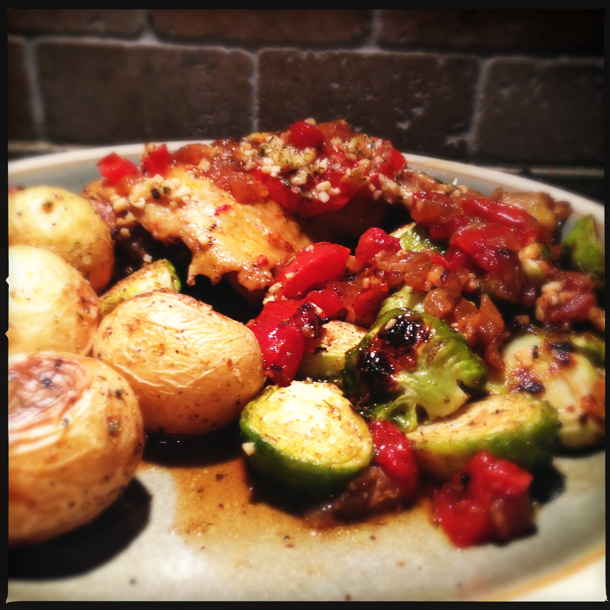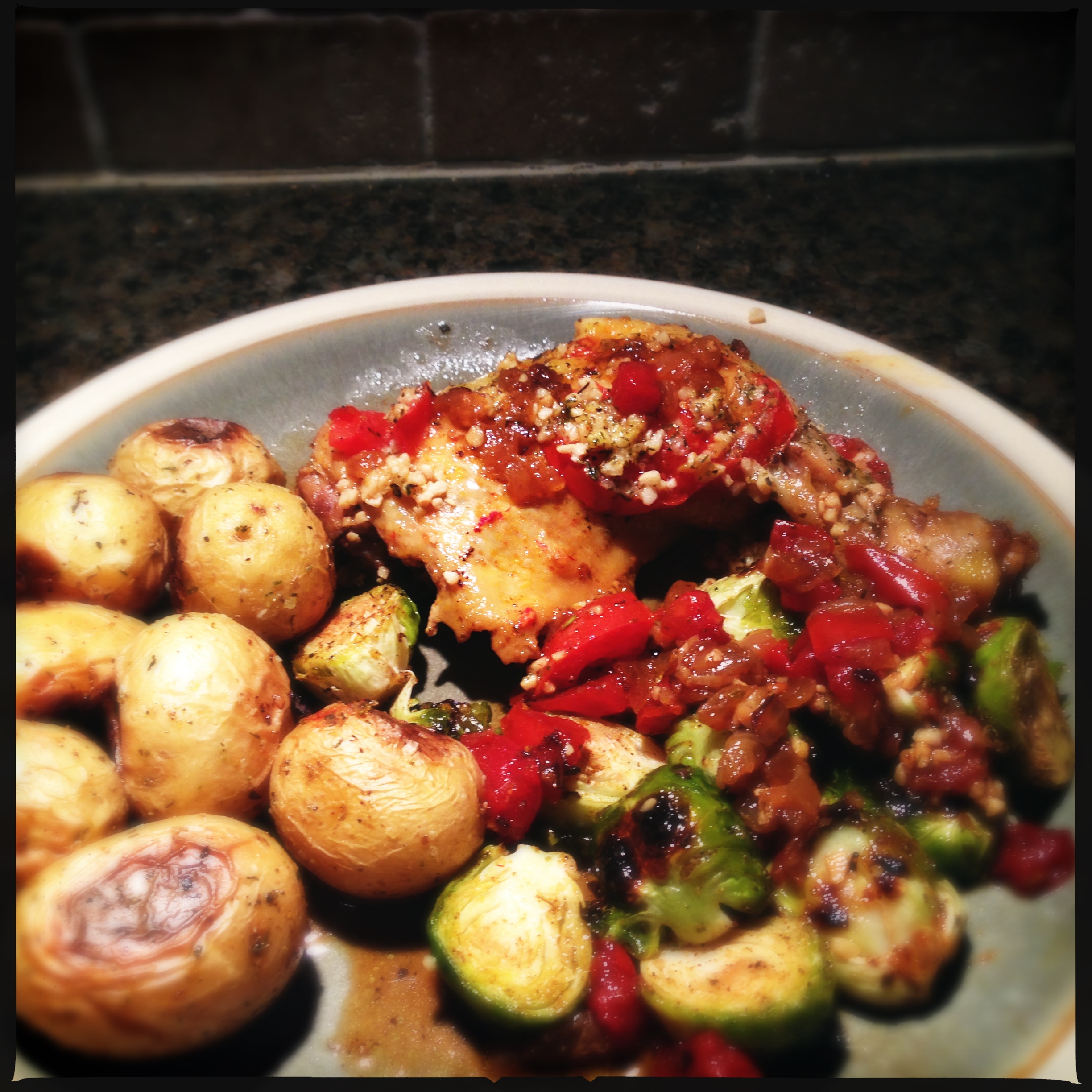 Place the covered dutch oven into the oven and bake at 375 for 30-40 minutes. The fats from the skin and the liquid from the tomatoes will keep things juicy even if you cook this dish a little longer than needed. I like to pair this with other goodies out of the oven as it gives me some time to relax and enjoy the aromas while everything is cooking. Typically I serve it with roasted brussels sprouts and roasted potatoes. Mashed potatoes also pair very well with it, especially covered with a healthy dose of the drippings from the chicken.