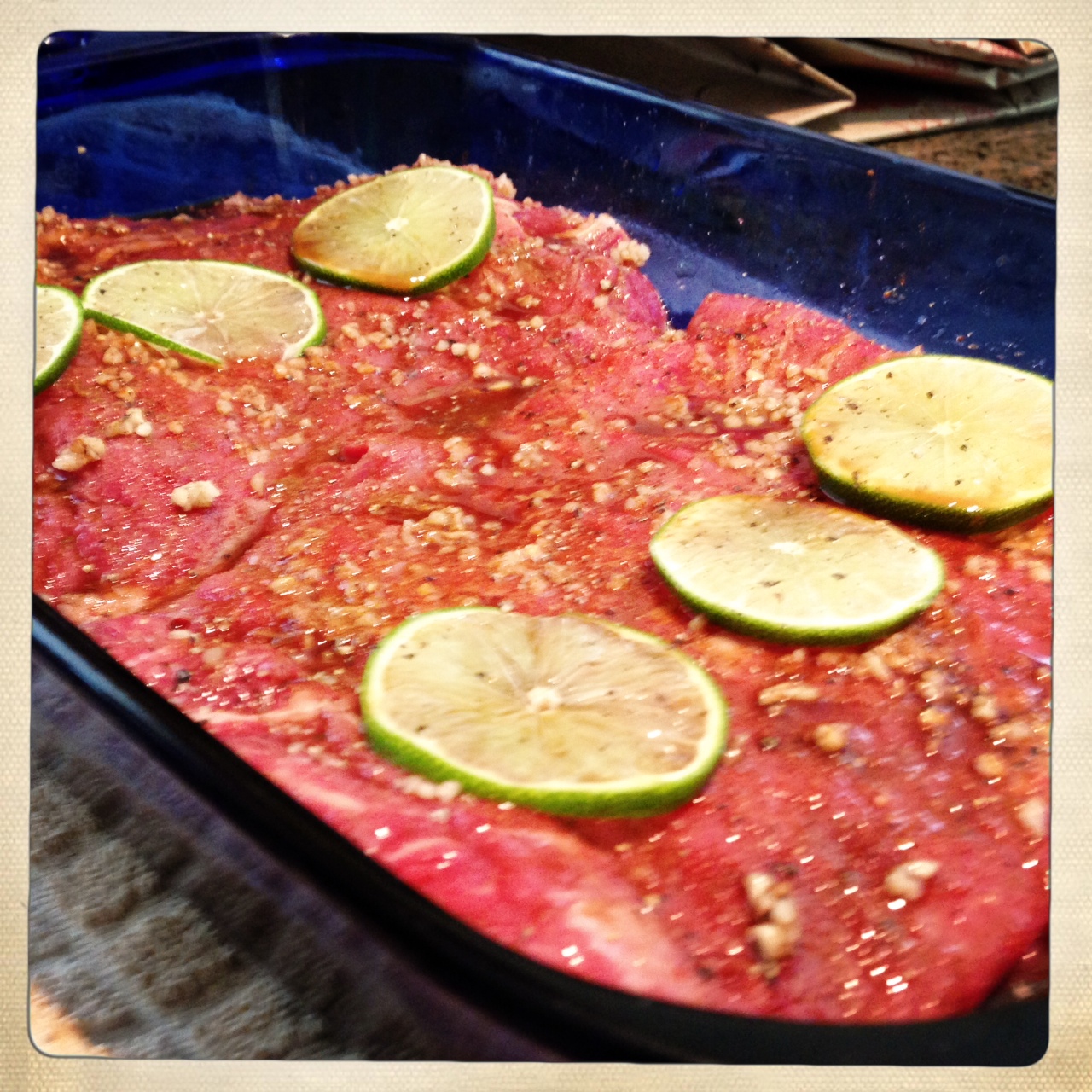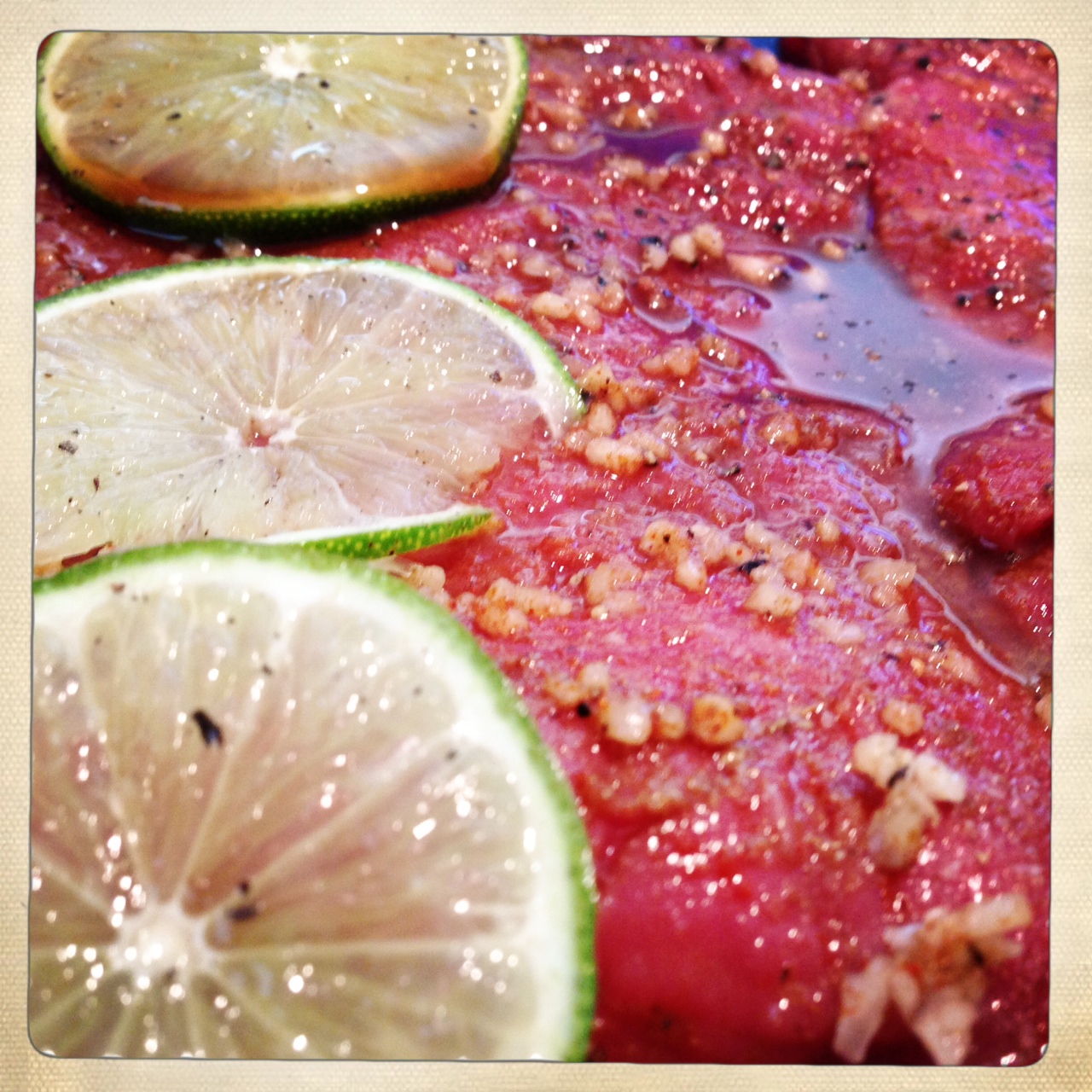 Squeeze the juice of one lime over the meat. Next add the Worchestershire sauce, garlic and a drizzle of olive oil. Turn the meat over a few times to coat both sides and rub the liquid and garlic in a bit with your hands.