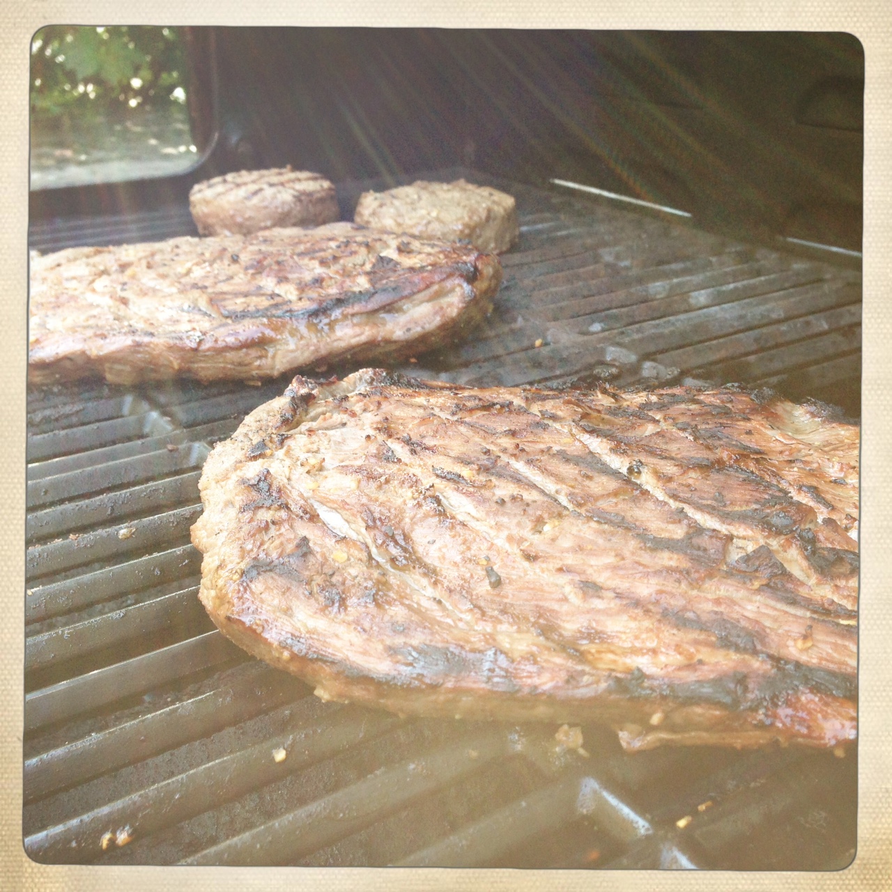Once you’re ready to cook, get your grill pre-heated a medium-high flame. When you remove the steak from the dish, let the excess marinade drip off, but don’t wipe or pat it dry. Whatever marinade sticks will caramelize on the grill, keeping that great flavor on the meat.