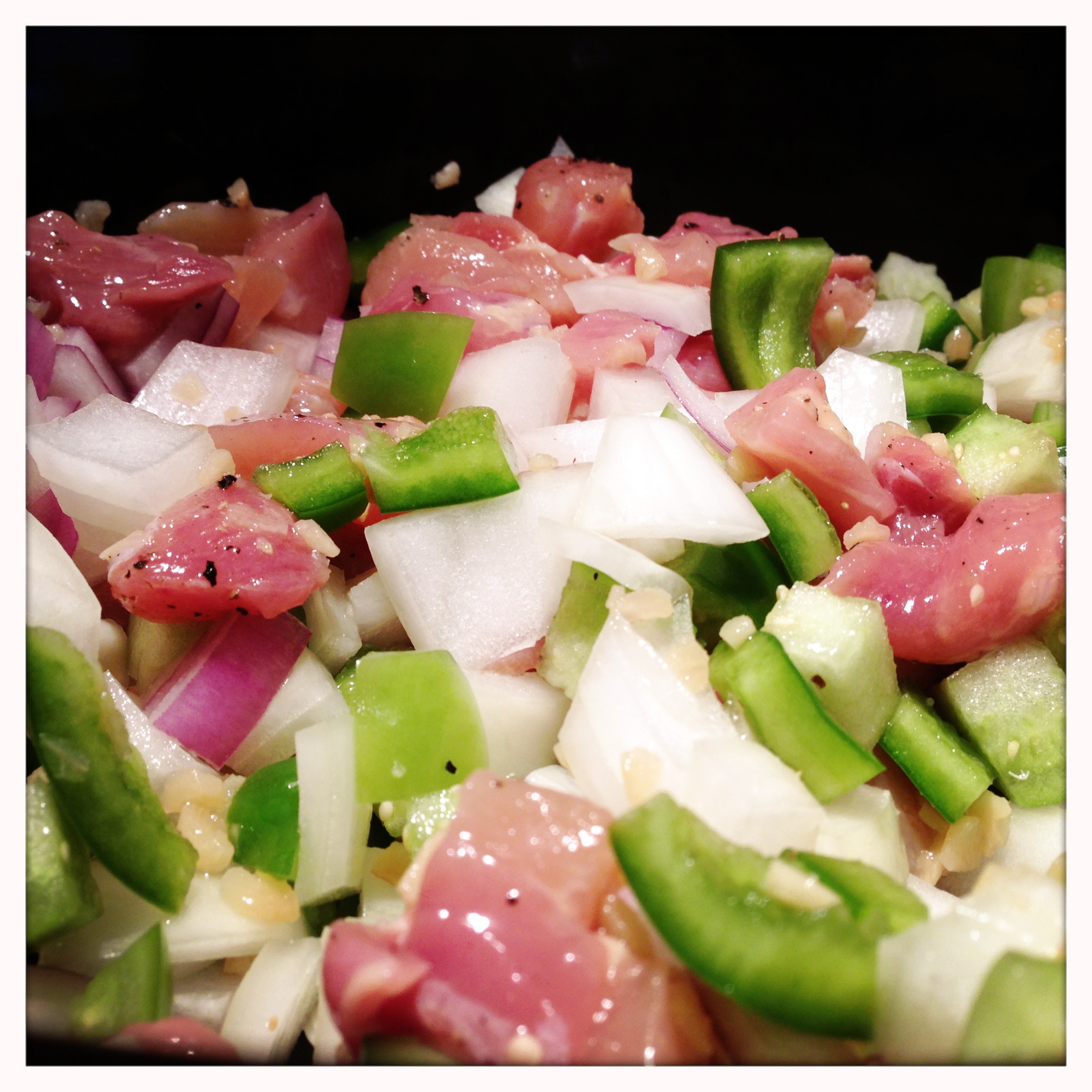 I like to layer in my ingredients when I make chili, starting with the meat and vegetables, then canned goods, then wet seasoning (worchestershire, chili sauce and lime juice) and dry seasoning (cumin, paprika, chili powder). Once everything is in the slow cooker, stir to roughly combine all the ingredients. For no particular reason other than habit, I always put a few grinds of black pepper on top after I’ve stirred right before I start the cooking.