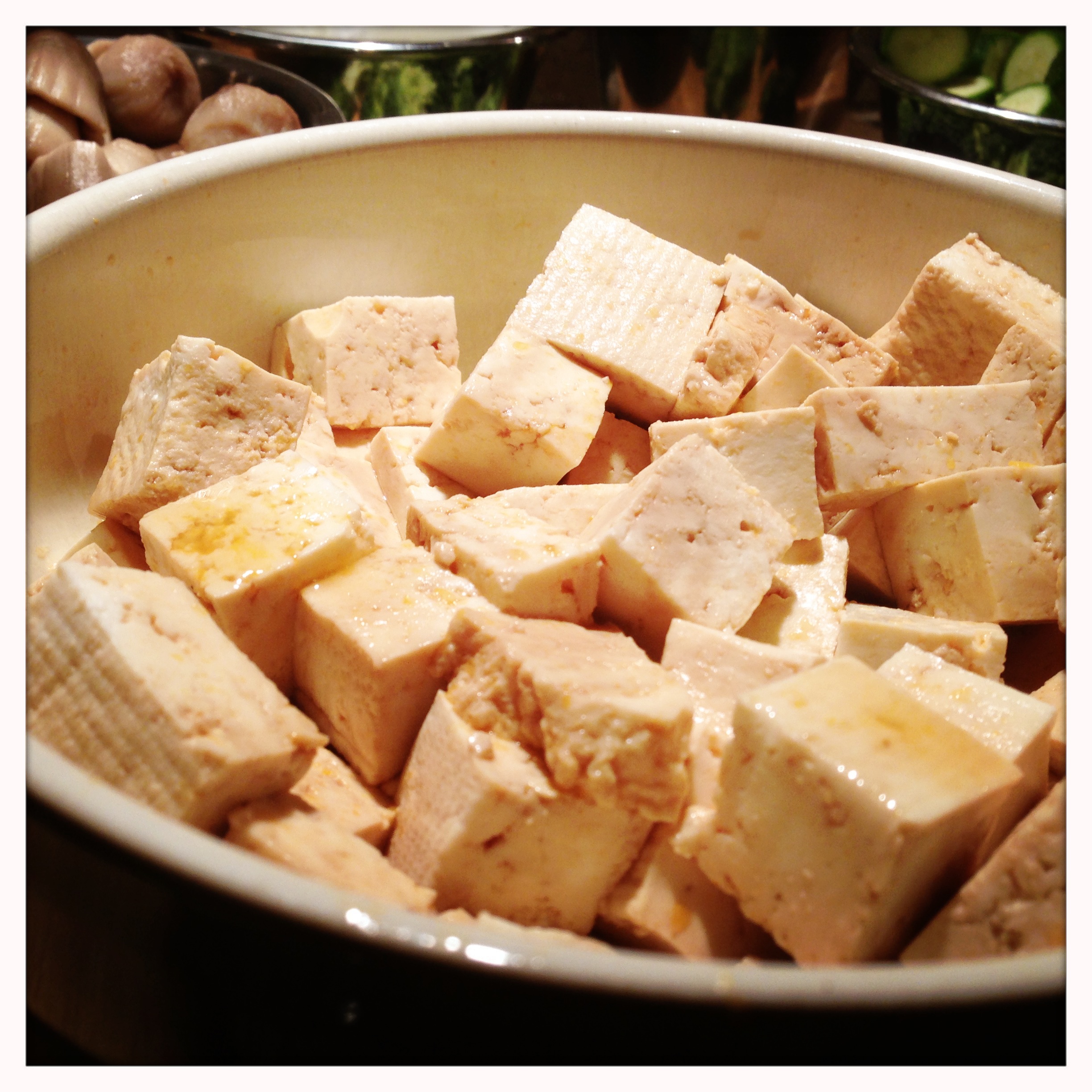 If you’ve never worked with tofu before, you may not know that there’s actually some prep involved prior to cooking. (I sure didn’t prior to a quick google on preparing tofu). As it turns out, it needs to be cubed, pressed and marinated before cooking to get the excess fluid out and put some flavor in.