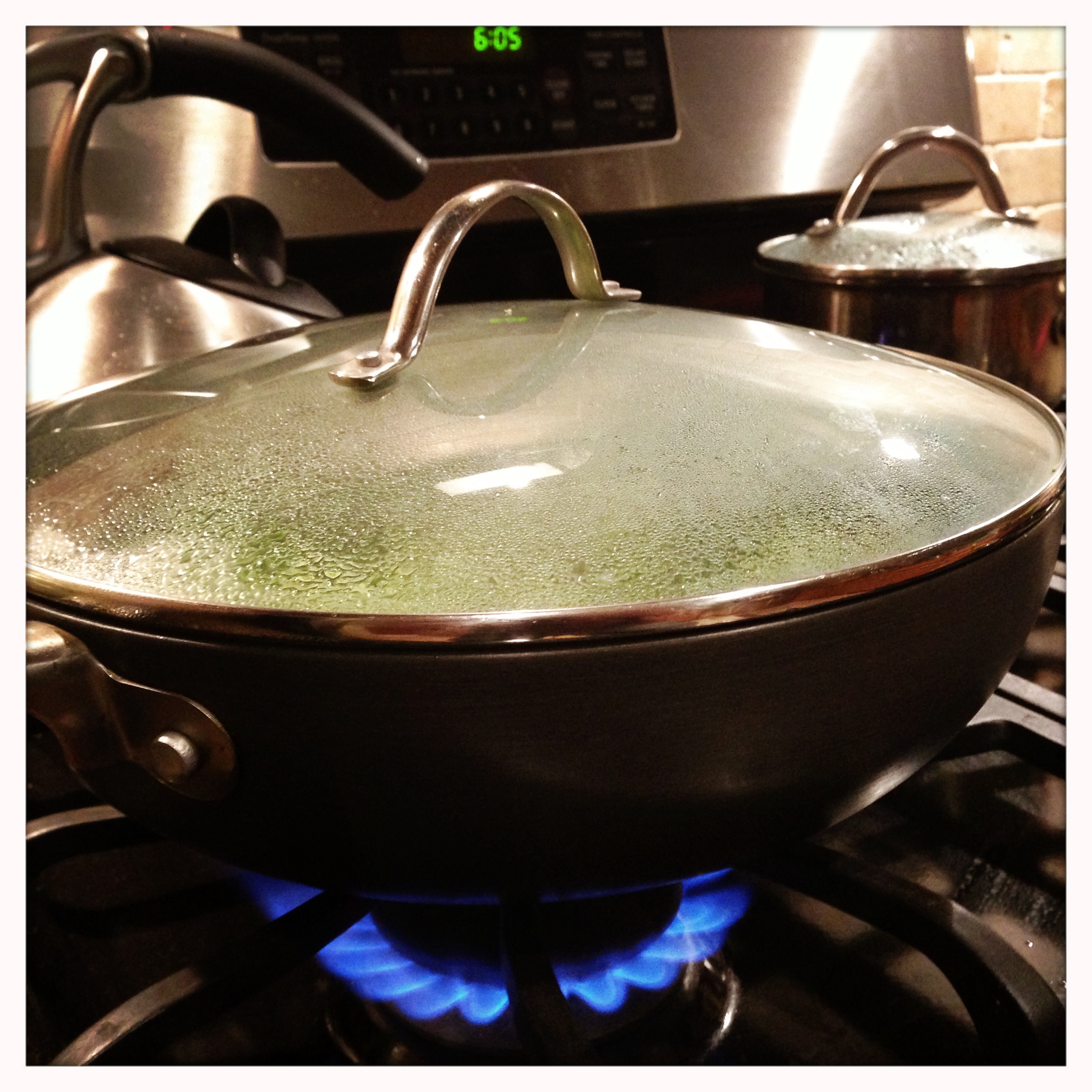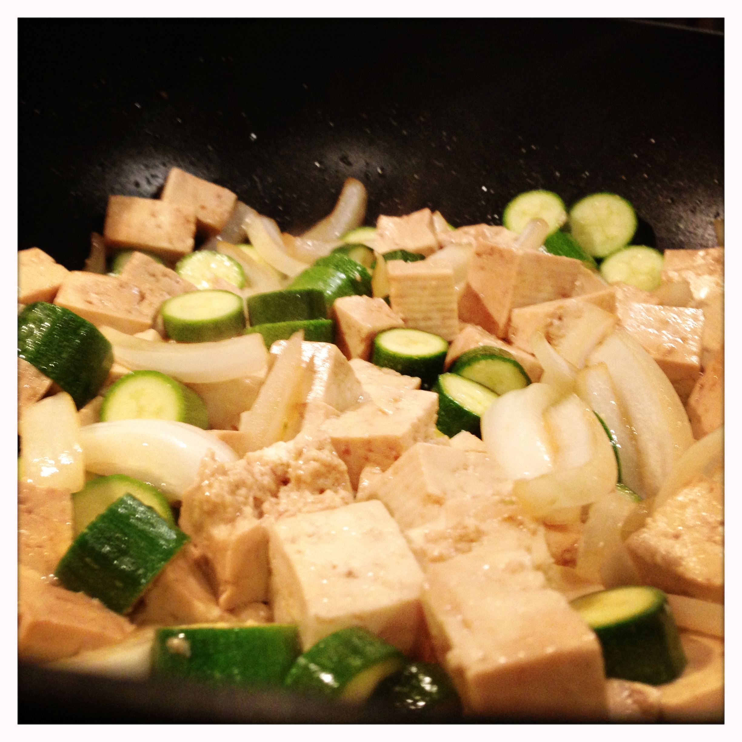 Once the onions and zucchini start to soften, toss the broccoli on top, drizzle with some soy sauce and cover. Let this cook for about 5 minutes covered. This will help brown the tofu sitting at the bottom of the pan and will also serve to steam the broccoli a bit.