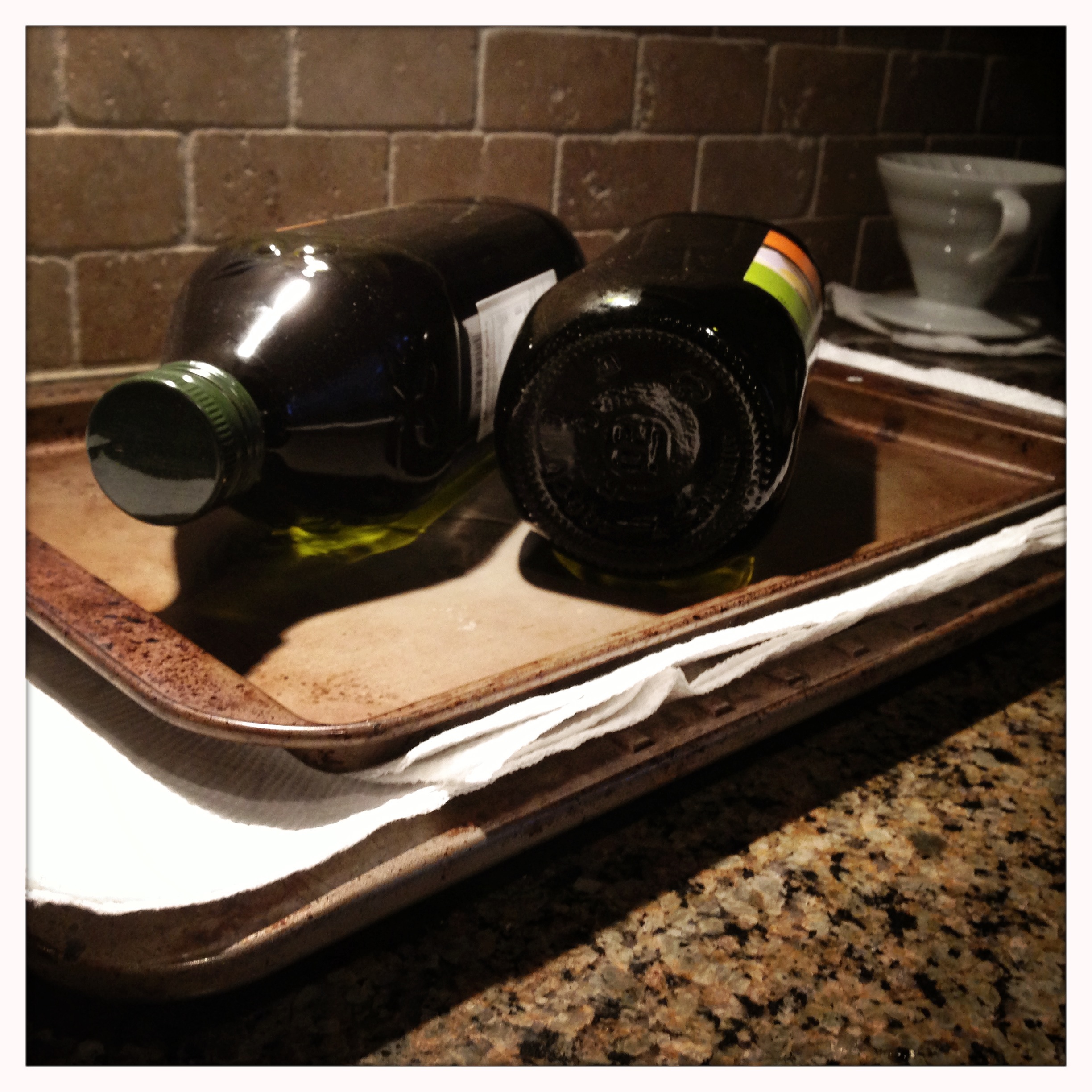 So, I cubed the tofu into somewhere between 1/2″ and 3/4″ cubes, doing my best to make them all about the same time. Next, place two layers of paper towel on a baking sheet and arrange the tofu cubes on the paper towels. Place two more layers of paper towel over the cubes, and place a second baking sheet on top. Weigh the top baking sheet with some cans or bottles. I used two large bottles of olive oil, which seemed to do the trick. Let this sit for about 20 minutes to squeeze out the excess water. (This is an excellent time to start your rice and/or get your vegetables ready. Cook the rice according to the directions on the package based on the type of rice you’re using.)