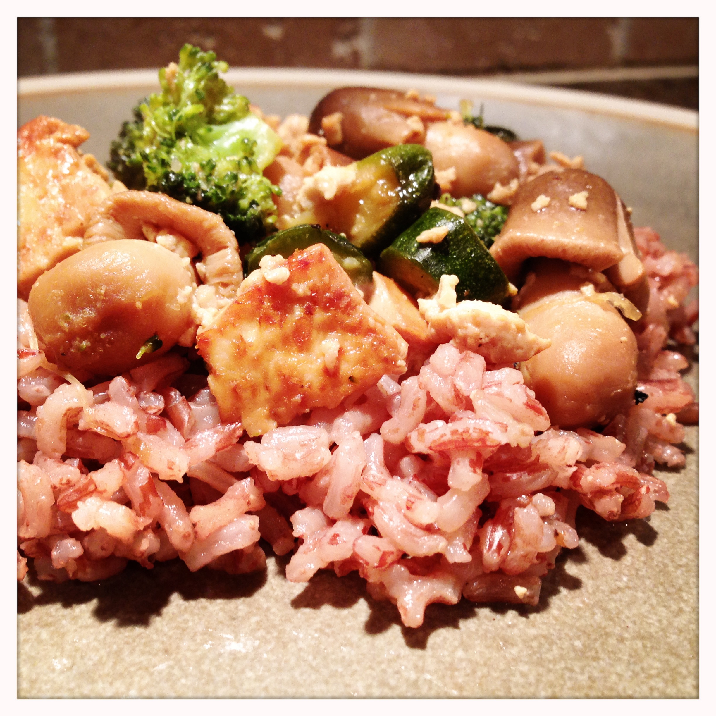 The other product in this recipe that was new to me was pink rice. I stumbled upon it when looking for my staple short grain brown rice, which I couldn’t find. It looked interesting, and it cooks in only 20 minutes, which is pretty impressive for a whole grain rice. It has a very delicate flavor, a little more satisfying than a white rice, but not quite as “bran-y” as a brown rice. If you can find it, I highly recommend it!