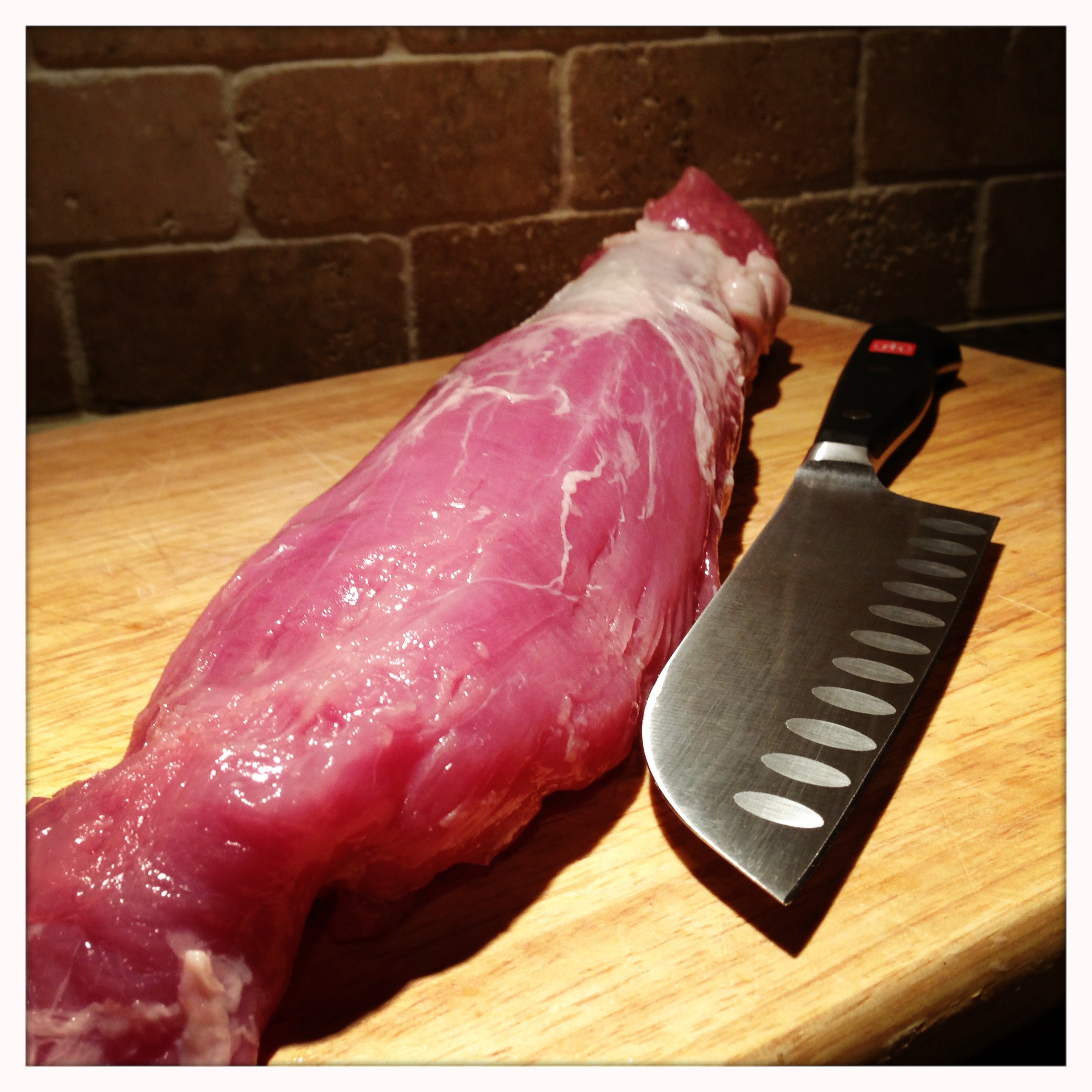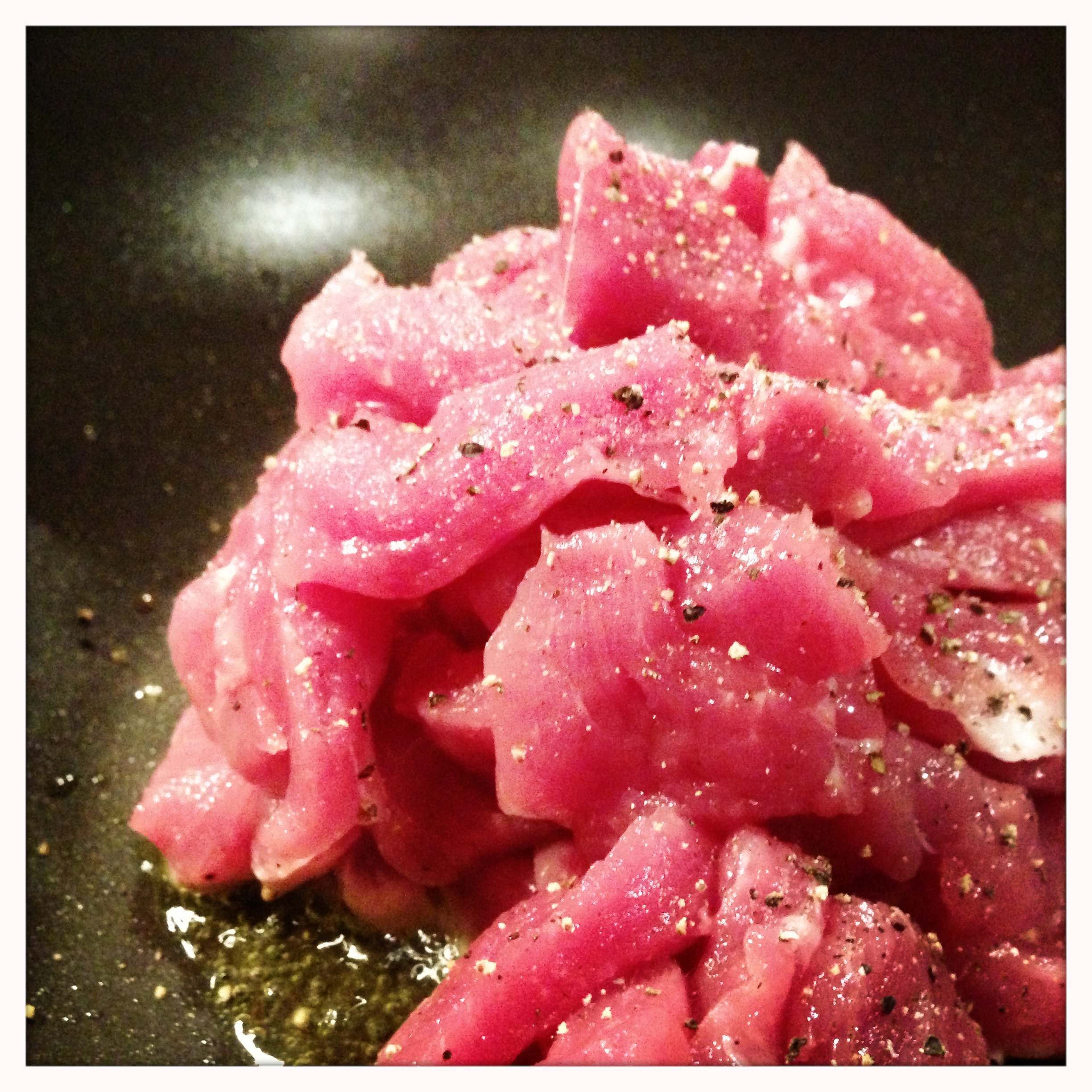 - 1 medium pork tenderloin, cut into 1/2″ wide strips