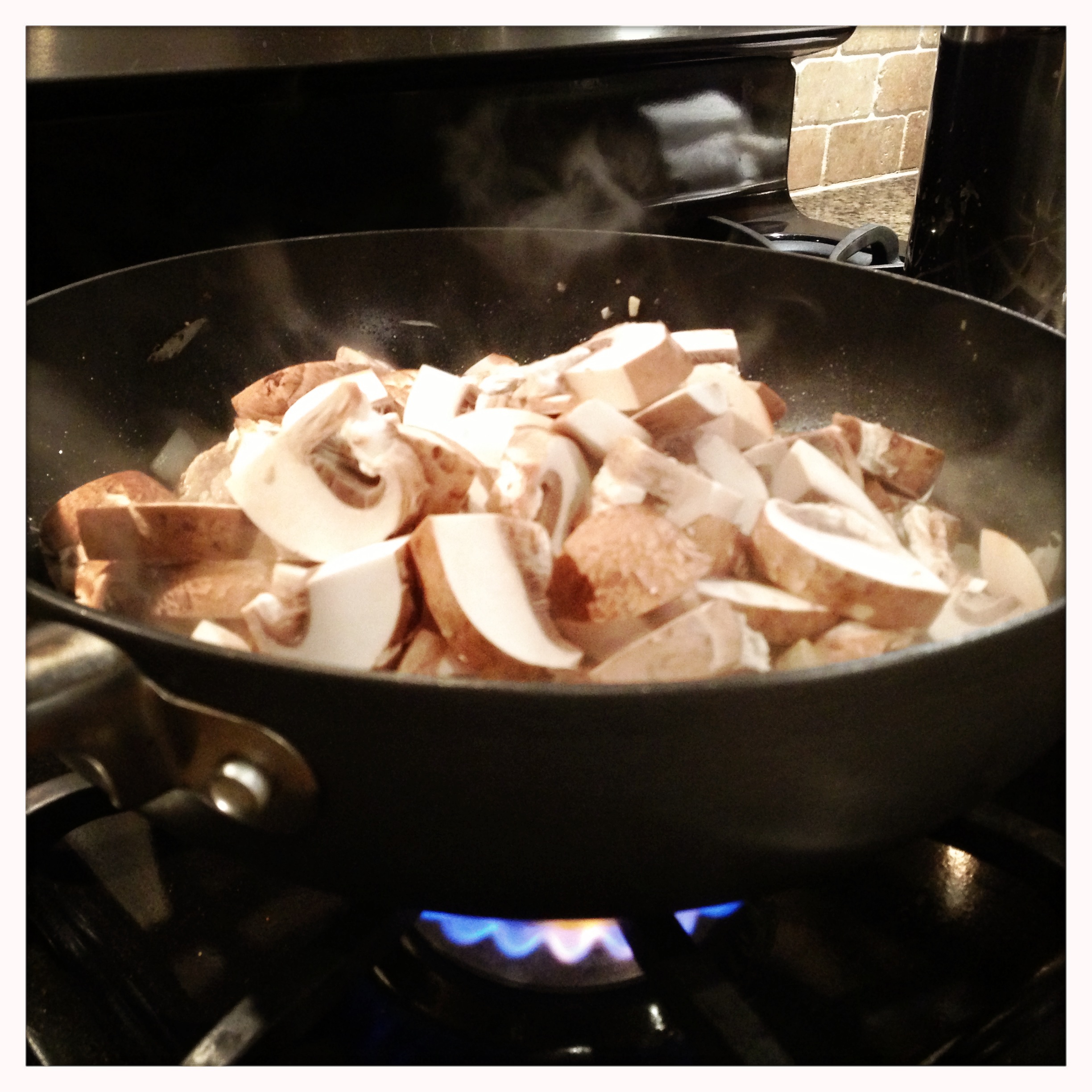 After adding the mushrooms, cover the pan, and let the mushrooms steam for a few minutes to soften. Then stir everything together and continue cooking the mushrooms. Once the mushrooms are almost completely cooked, add the onion soup mix.