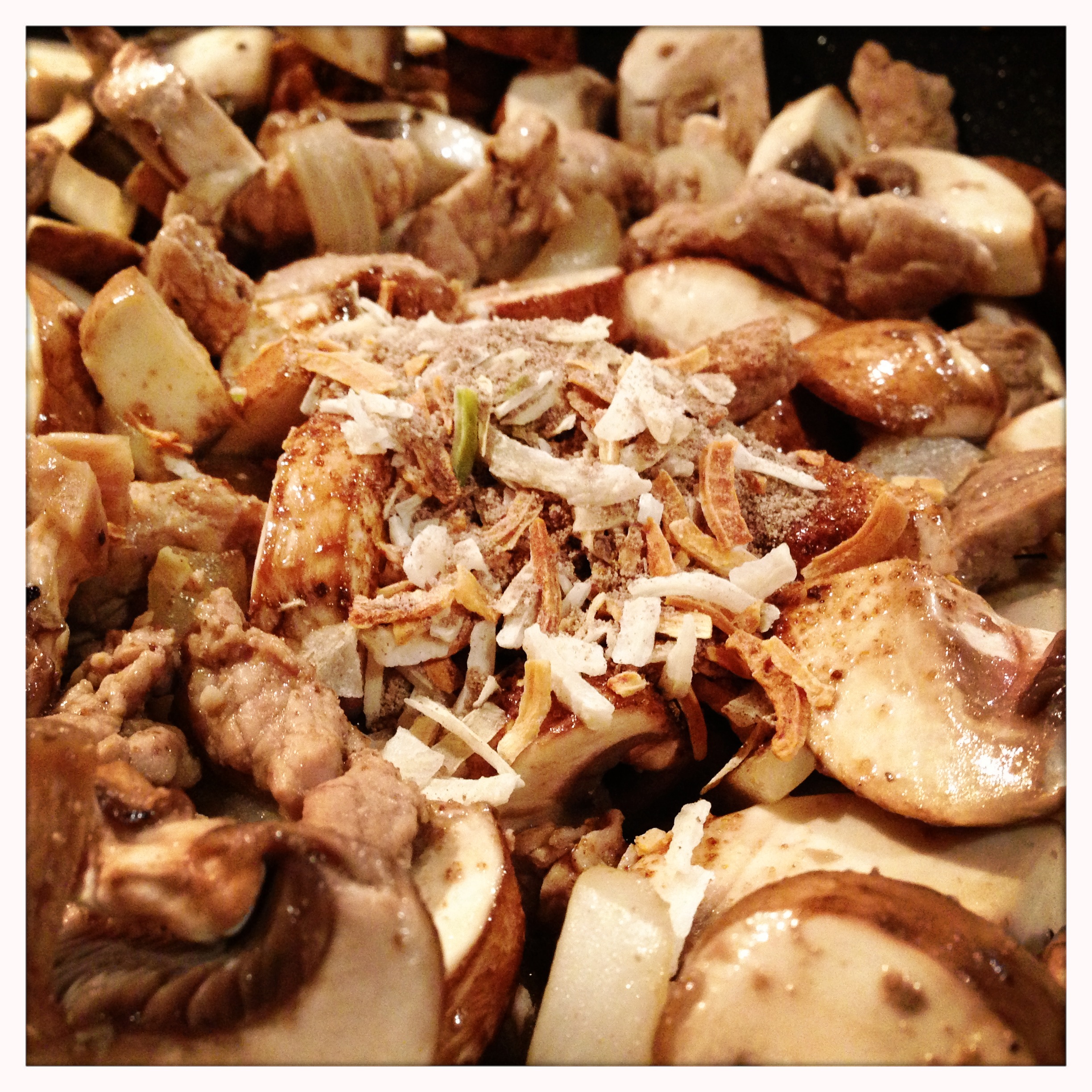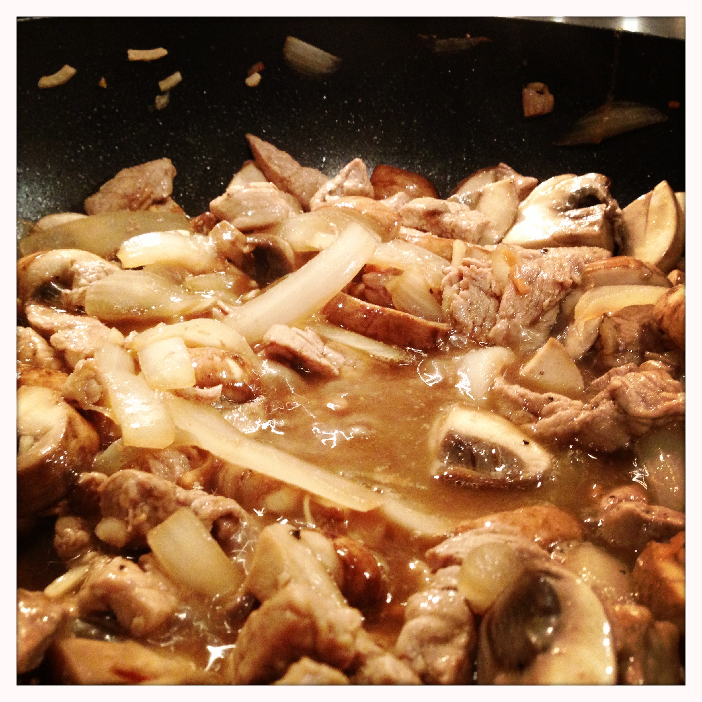 Once the pork has started to brown, add the onion and garlic and continue to cook until the onion starts to soften. Add the mushrooms and the worchestershire sauce.