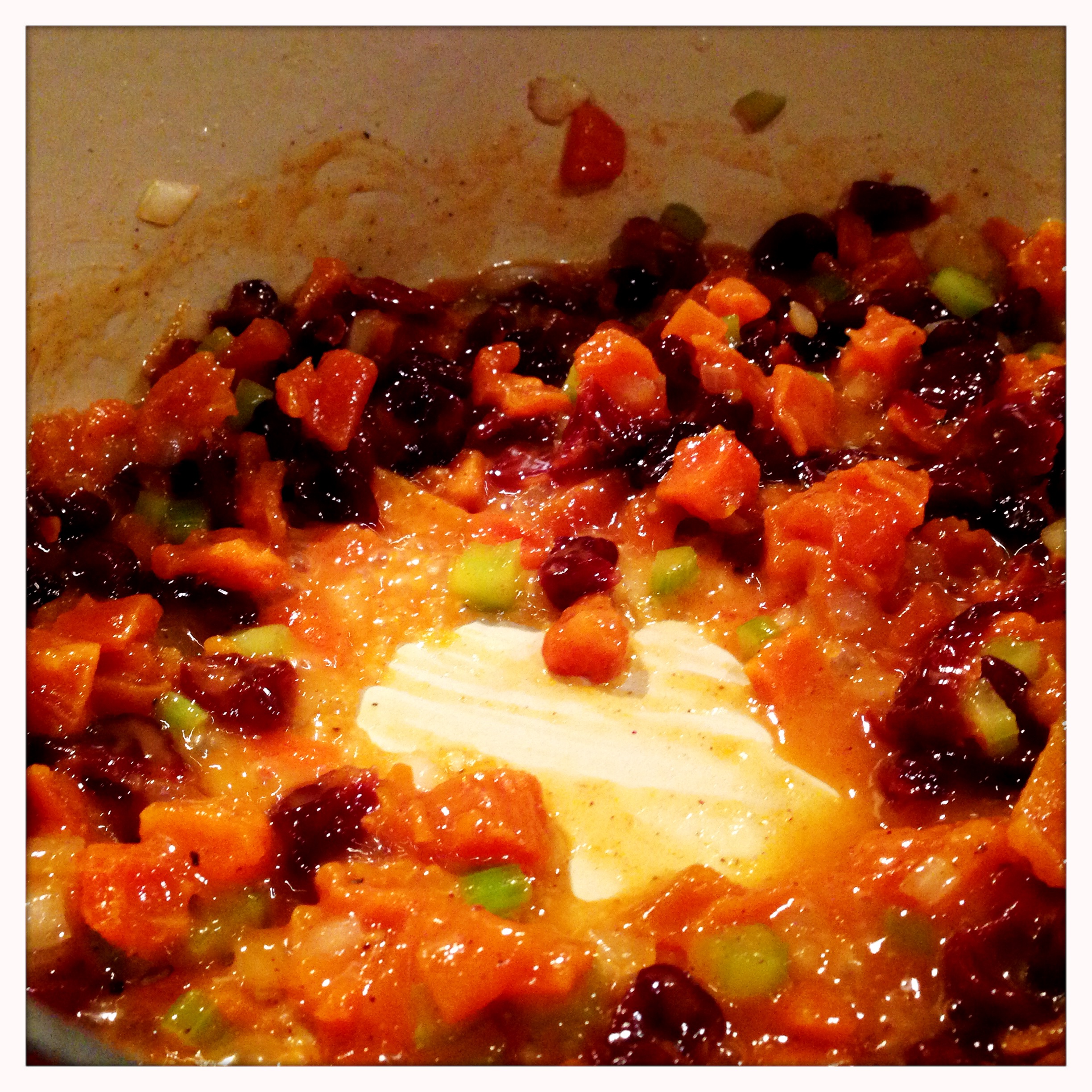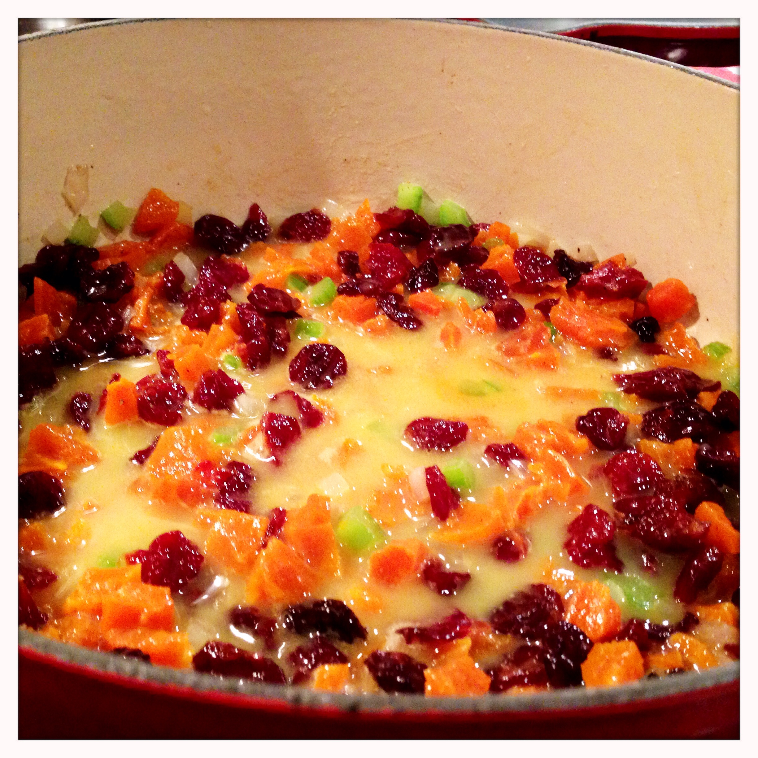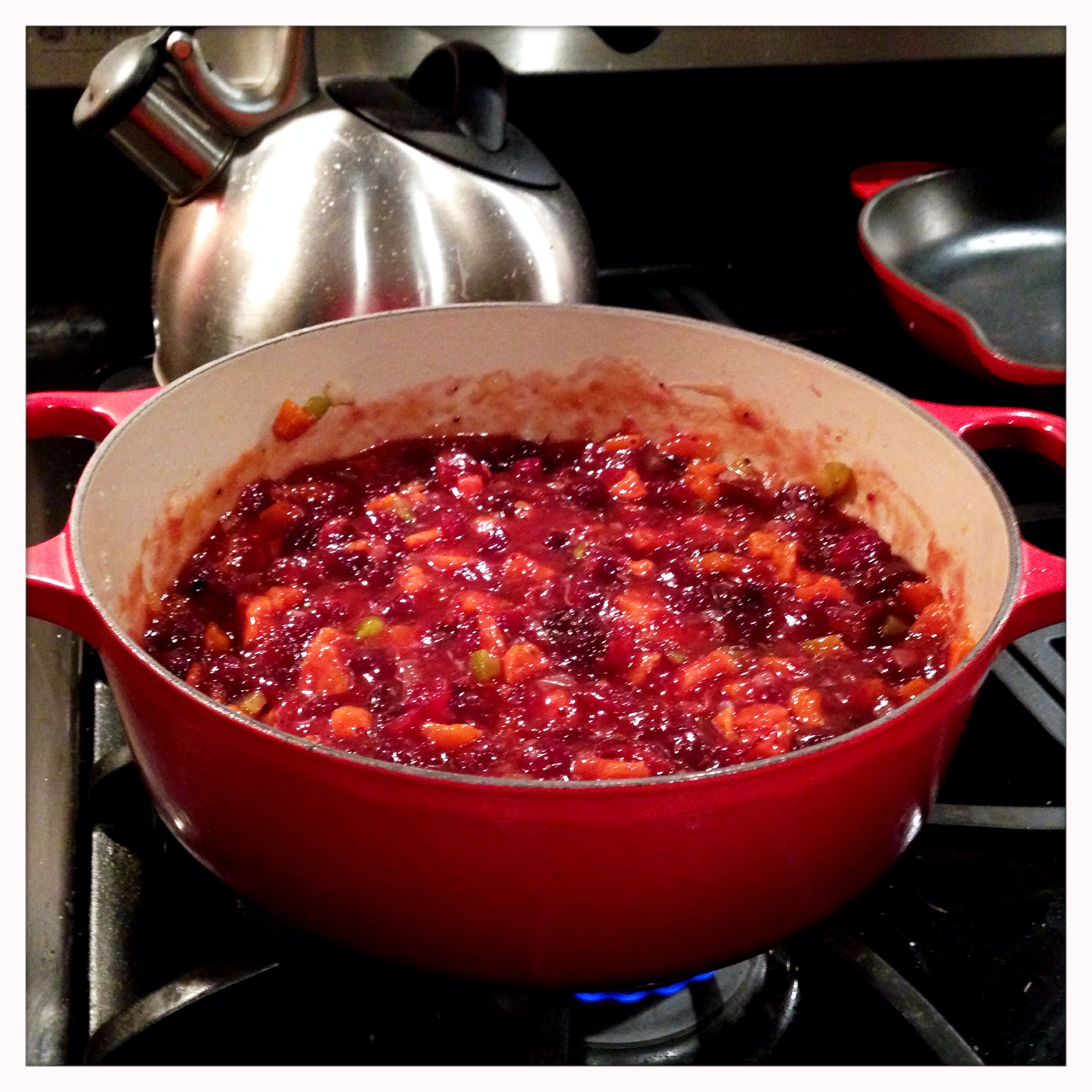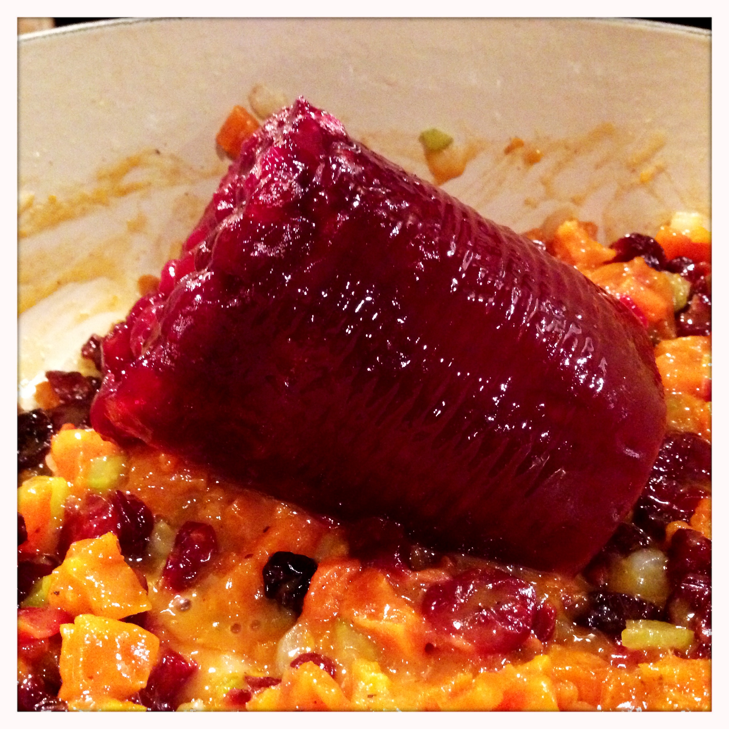 Once the juice has gotten syrupy and the kitchen is smelling amazing, add the cranberry sauce.