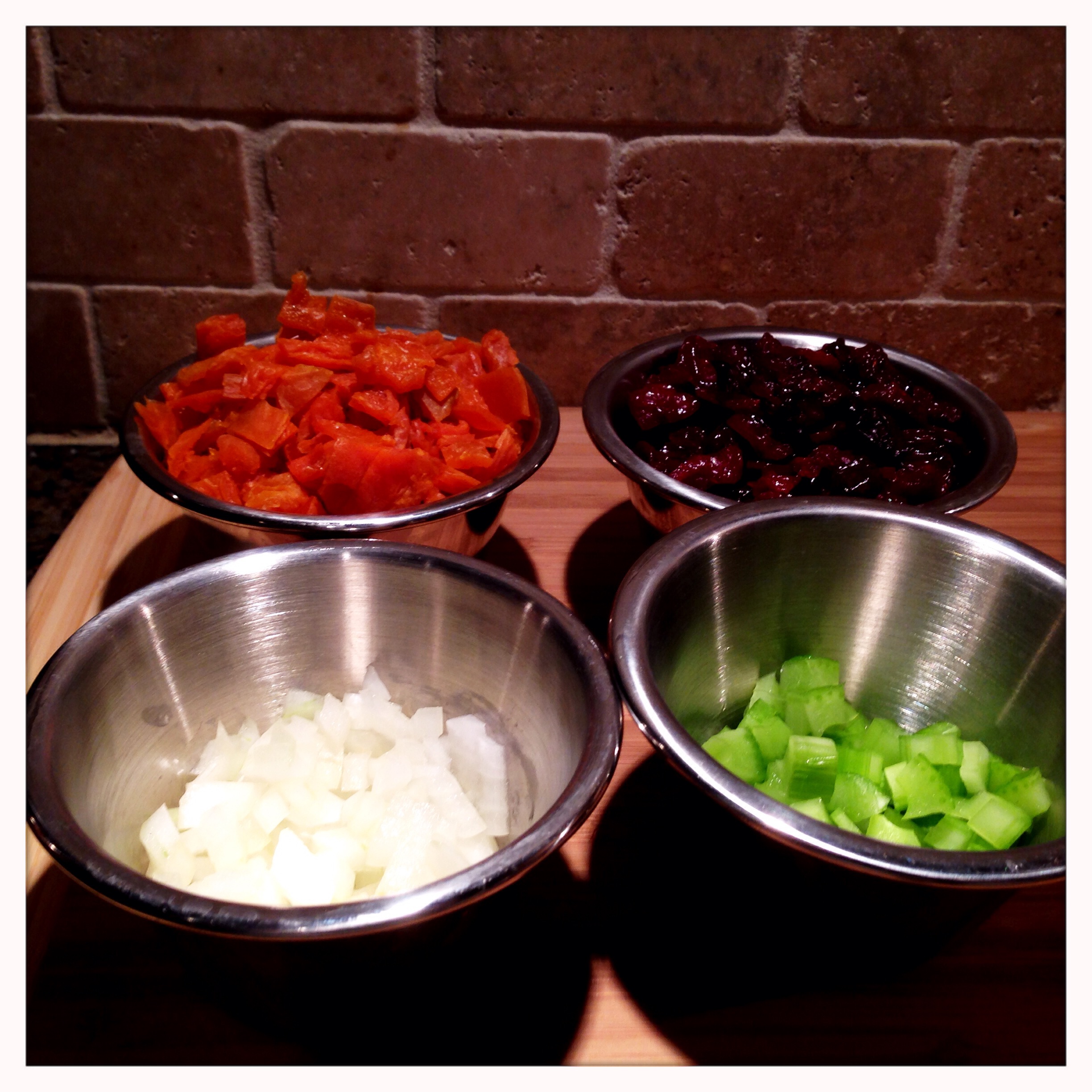 Finely dice your onion and celery. It doesn’t need to be minced, but you want fairly small pieces. These aromatic vegetables are being used to add flavor, but no one wants a big chunk of celery in their cranberry relish. The dried cherries can be left whole, but you’ll want to chop the apricots. I used the size of the cherries as a rough guide for chopping the apricots. Of note, I used slab apricots rather than the Turkish apricots. Slab apricots, sometimes called California style apricots, have a much more intense apricot flavor. They are more tart than the Turkish apricots, but also have a much fresher flavor, which will help them cut through the other flavors in this relish.