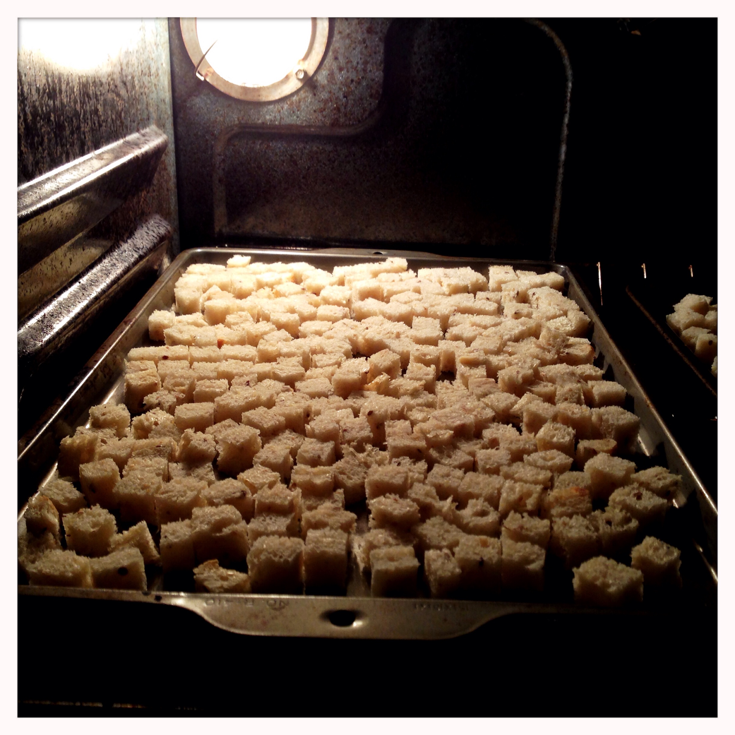 Once the oven is preheated, turn the heat down to 200 degrees. Lay the bread cubes on a baking sheet in a single layer, and place in the oven.