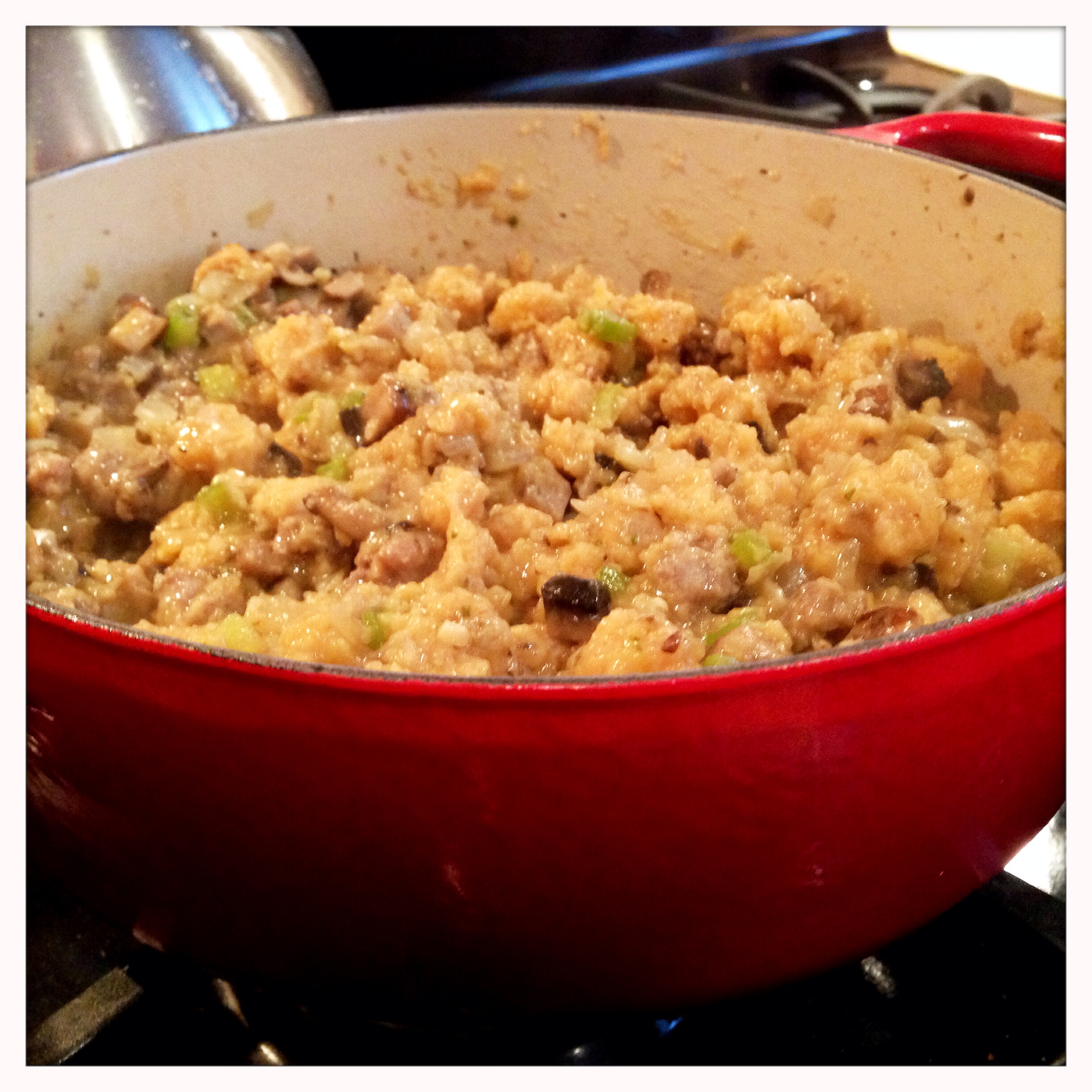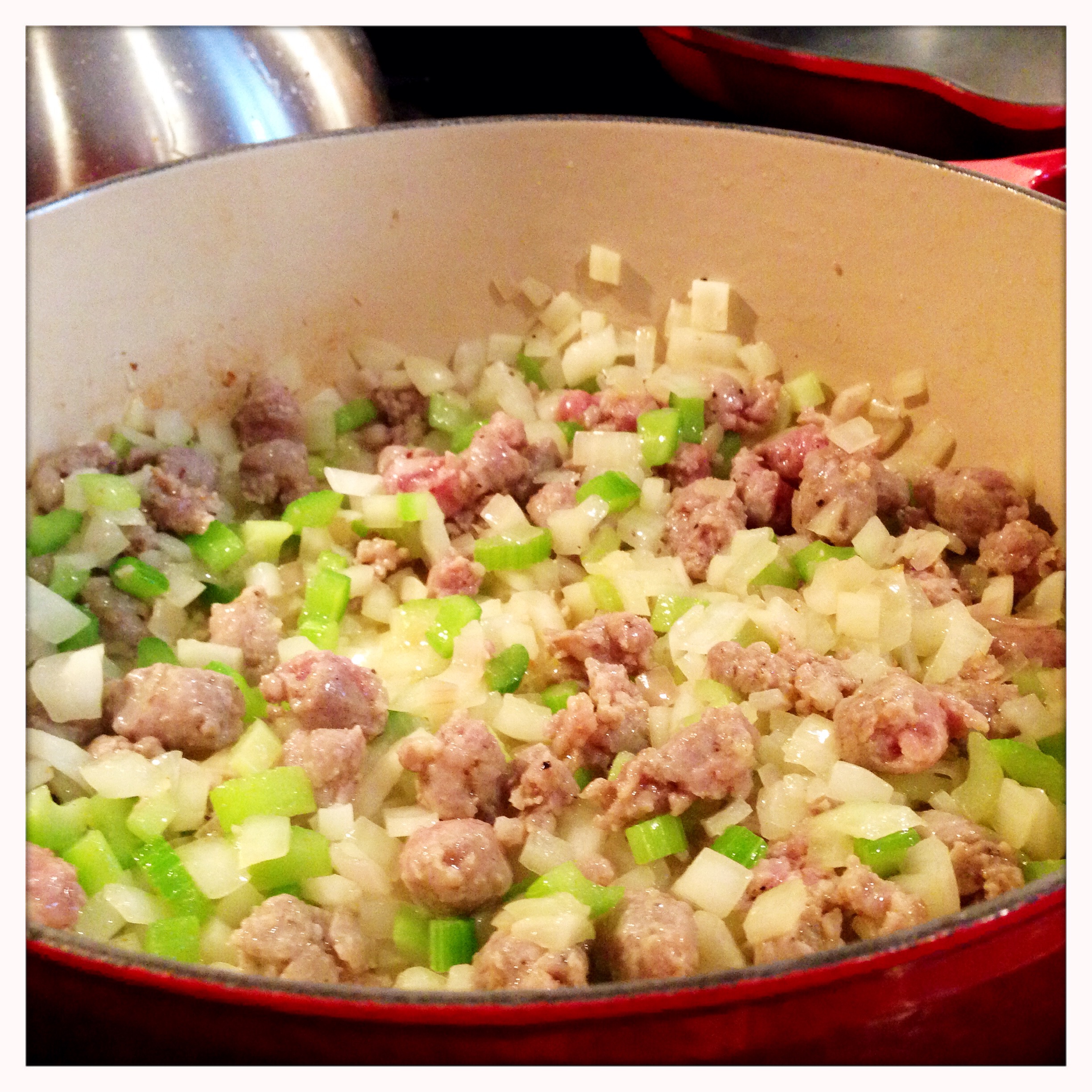 When it’s time to make the stuffing, heat some butter and olive oil in a heavy, oven safe pan. I use a French oven since it is easy to take from the stove top to the oven to the table. Once the butter and oil are hot, saute the celery, shallots and onion. Season with salt and pepper to taste. While they start to cook, turn your attention to the breakfast sausage.
