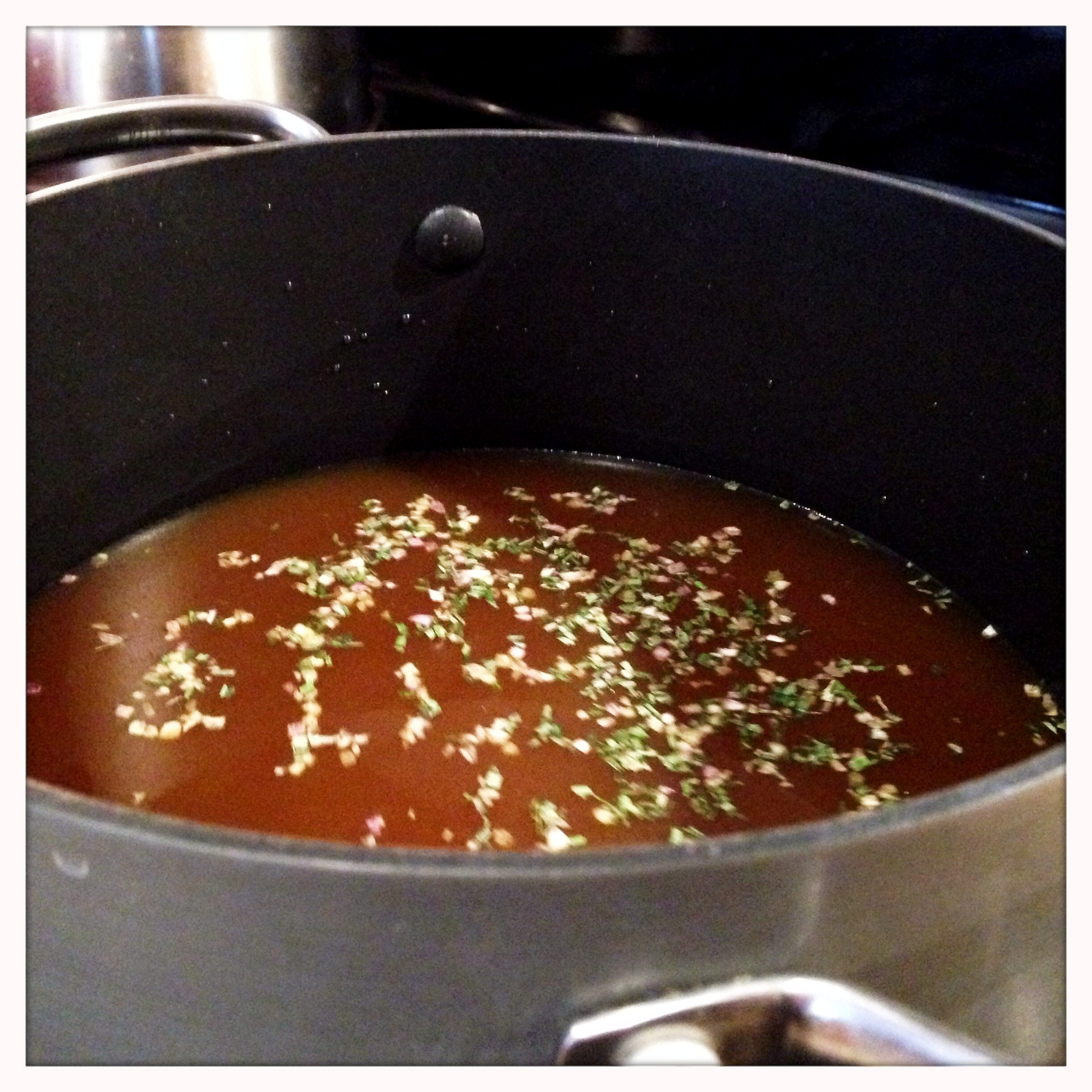 While the vegetables and mushrooms are continuing to cook, bring the chicken stock to a boil in a second pot. I like to add some pepper and my herb blend to the stock while it comes up to a boil.