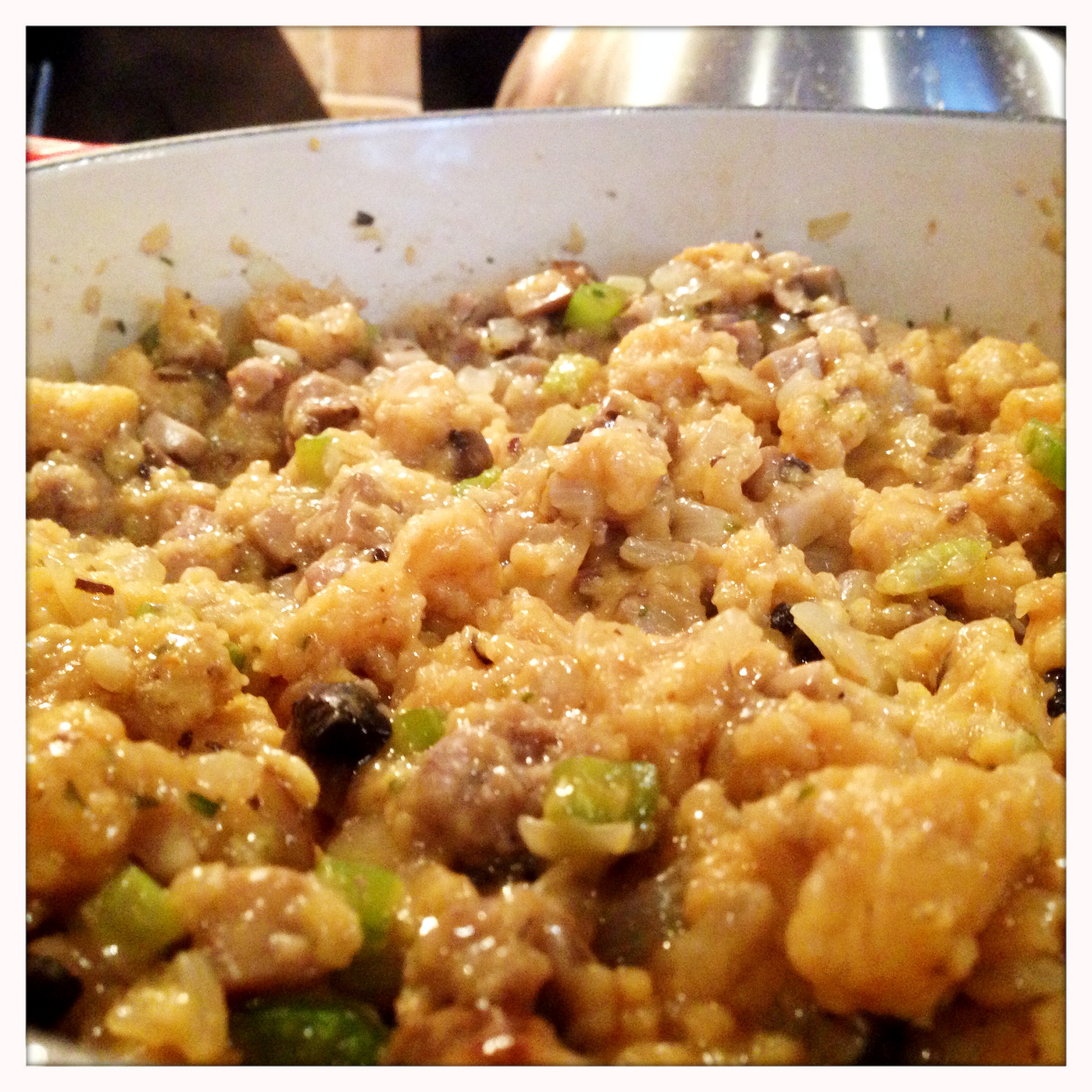 Once the stock is boiling, turn the heat off, and add the bread cubes. Stir gently for a few minutes until the bread is evenly wet and soft. Add the stock soaked bread cubes to the pan with the vegetables and sausage and stir thoroughly to combine.