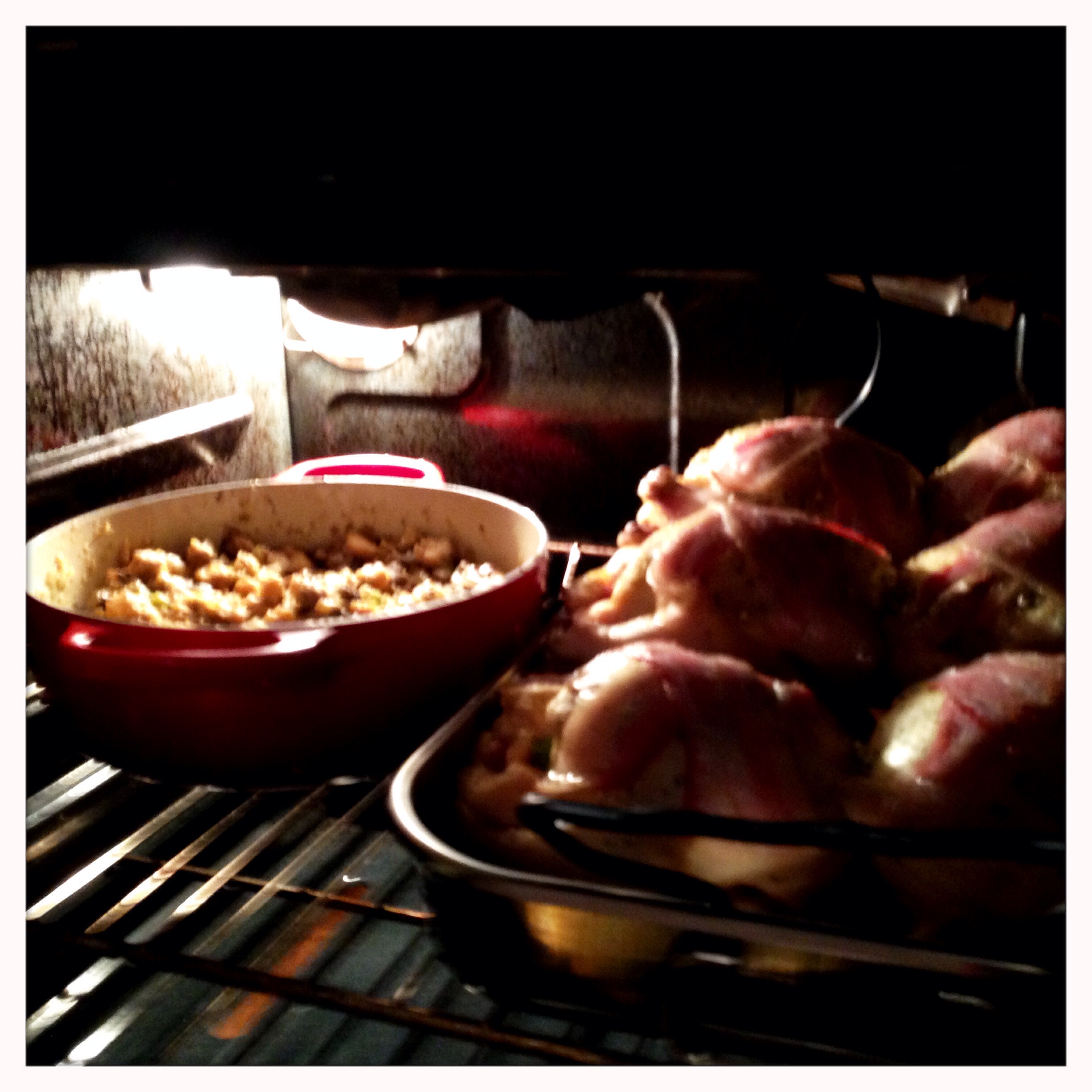 I started with a hearty multigrain sourdough, added a hefty dose of mushrooms and veggies and finished it with an herb and spice blend to mimic the seasoning of the main course (in this case, cornish hens, which will be featured in a future post).