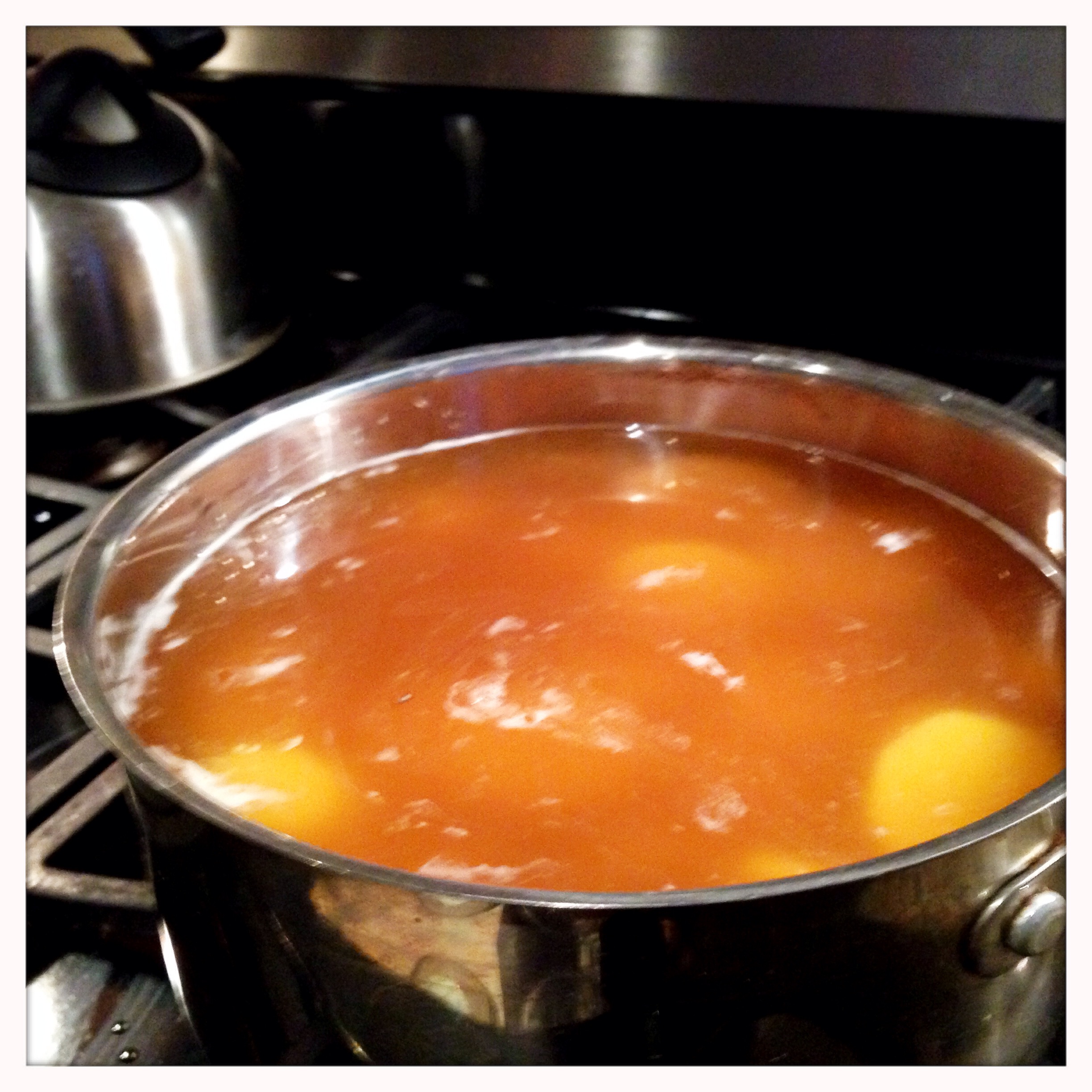 Peel and slice about 2 lbs of golden potatoes, or whatever quantity you need for your specific meal. I use slices about 1/4″ thick so they cook quickly and absorb as much flavor as possible while cooking. Place the potatoes into a pot and cover with the chicken stock. If using unsalted stock, add a little salt to the pot. Add water to the pot until you have enough fluid to cover the potatoes.
