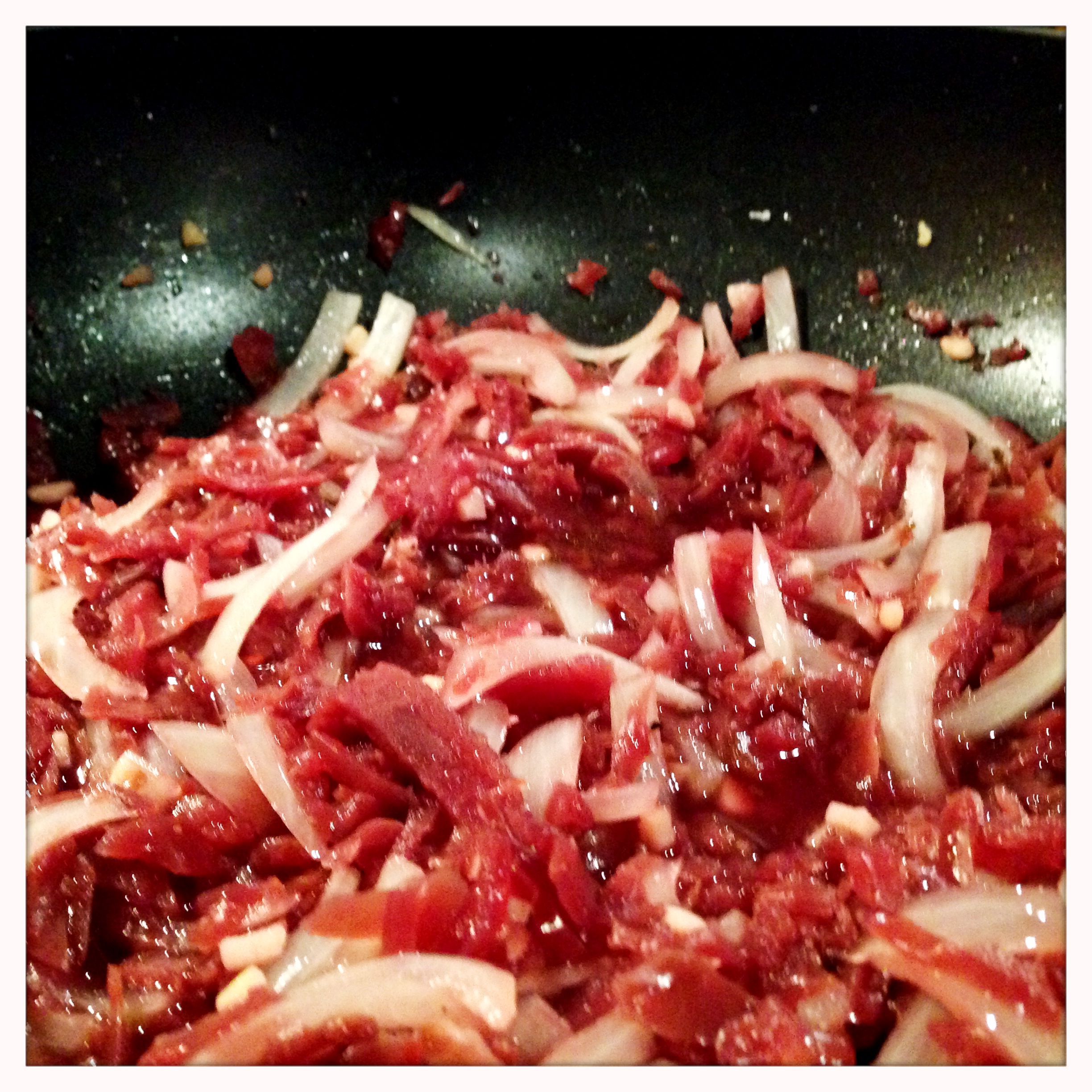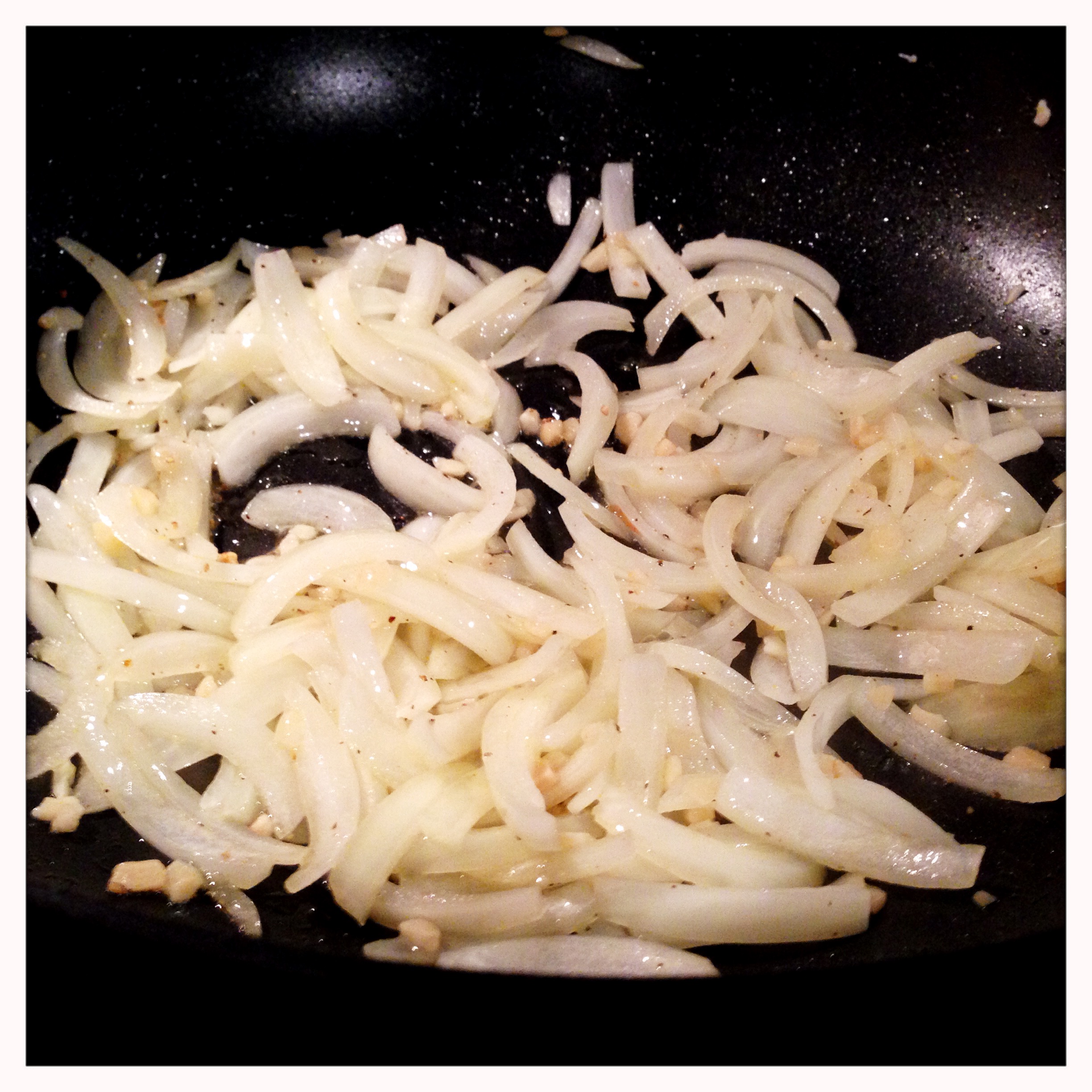 Heat a little olive oil in a pan and saute the onions until they start to soften. Add the garlic, and season with a little salt and pepper to taste.
