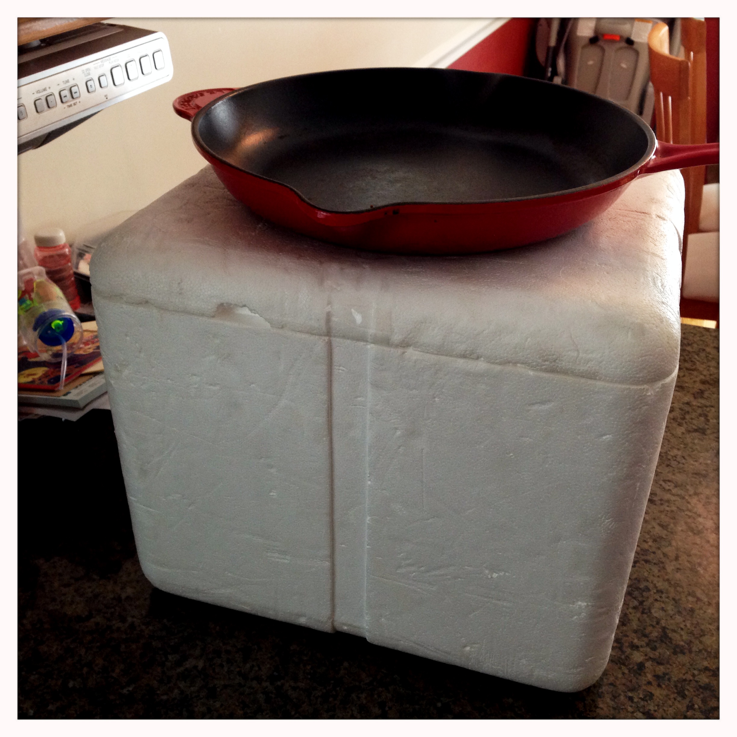Then I tightly wrapped the shoulder with the foil to trap the juices, and I put it in the oven at 275 for about an hour and a half. After that, wrapped the pork (still wrapped in foil, do NOT open the foil here) in two clean t-shirts and placed that inside a cooler to rest. I filled the rest of the cooler with crumpled paper to fill the space, and held the lid down with an iron skillet.