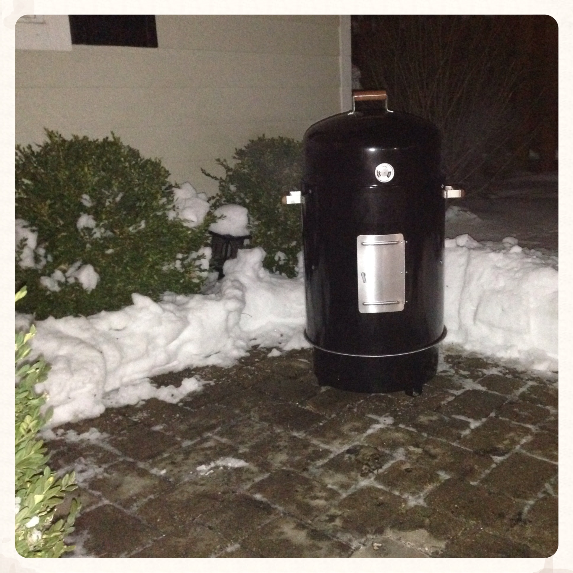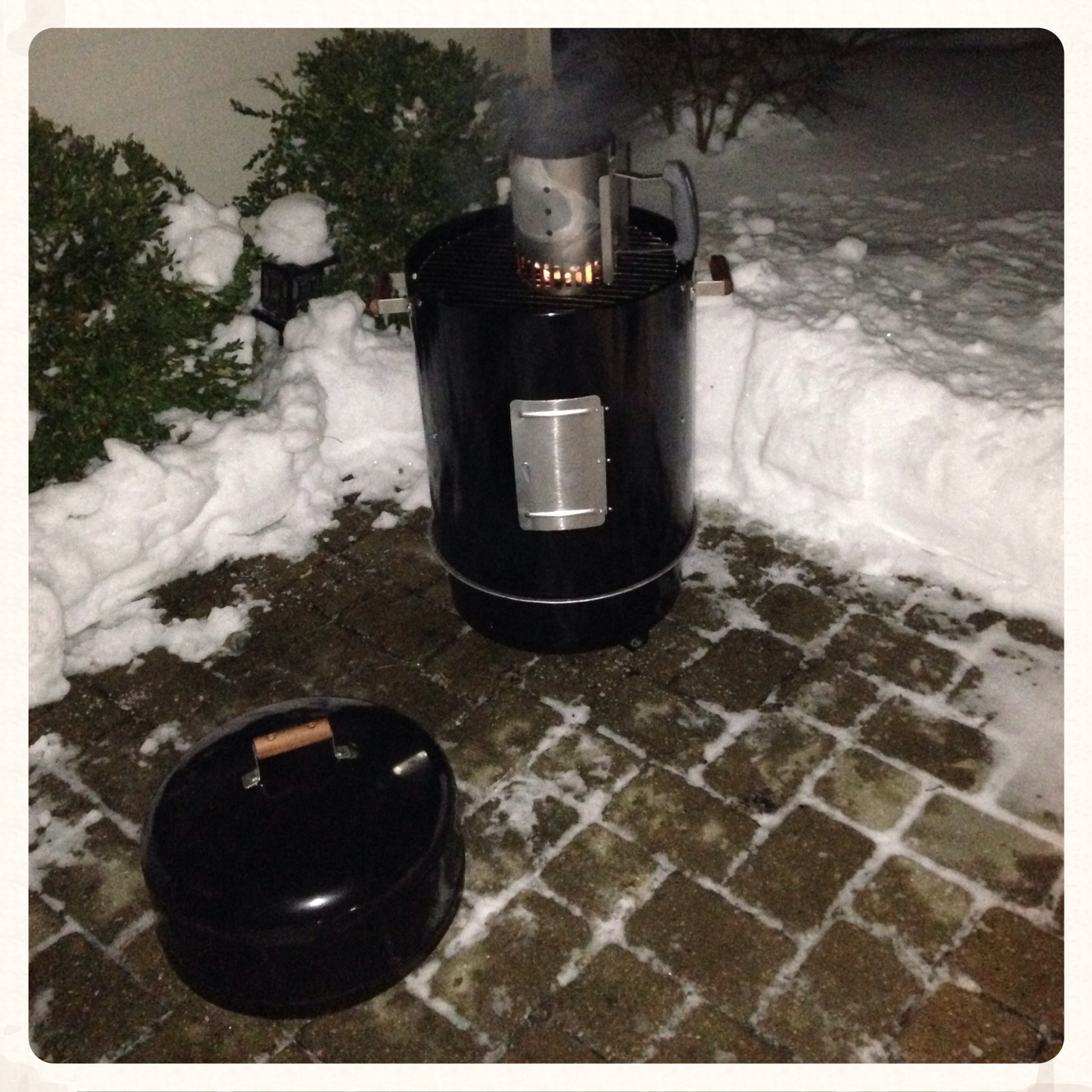 Weather has been tricky here with a lot of wind and snow, but I managed to find a good window a few days ago with temps in the 20s and about 10 hours with no snow, so it was time to inaugurate my new toy. I got myself a 7 lb bone-in pork shoulder (known as a Boston Butt), and a good amount of charcoal. I also made a few tweaks to the smoker itself based on recommendations from various sources (the most helpful of which has been BBQ Brethren – definitely worth checking out!).
