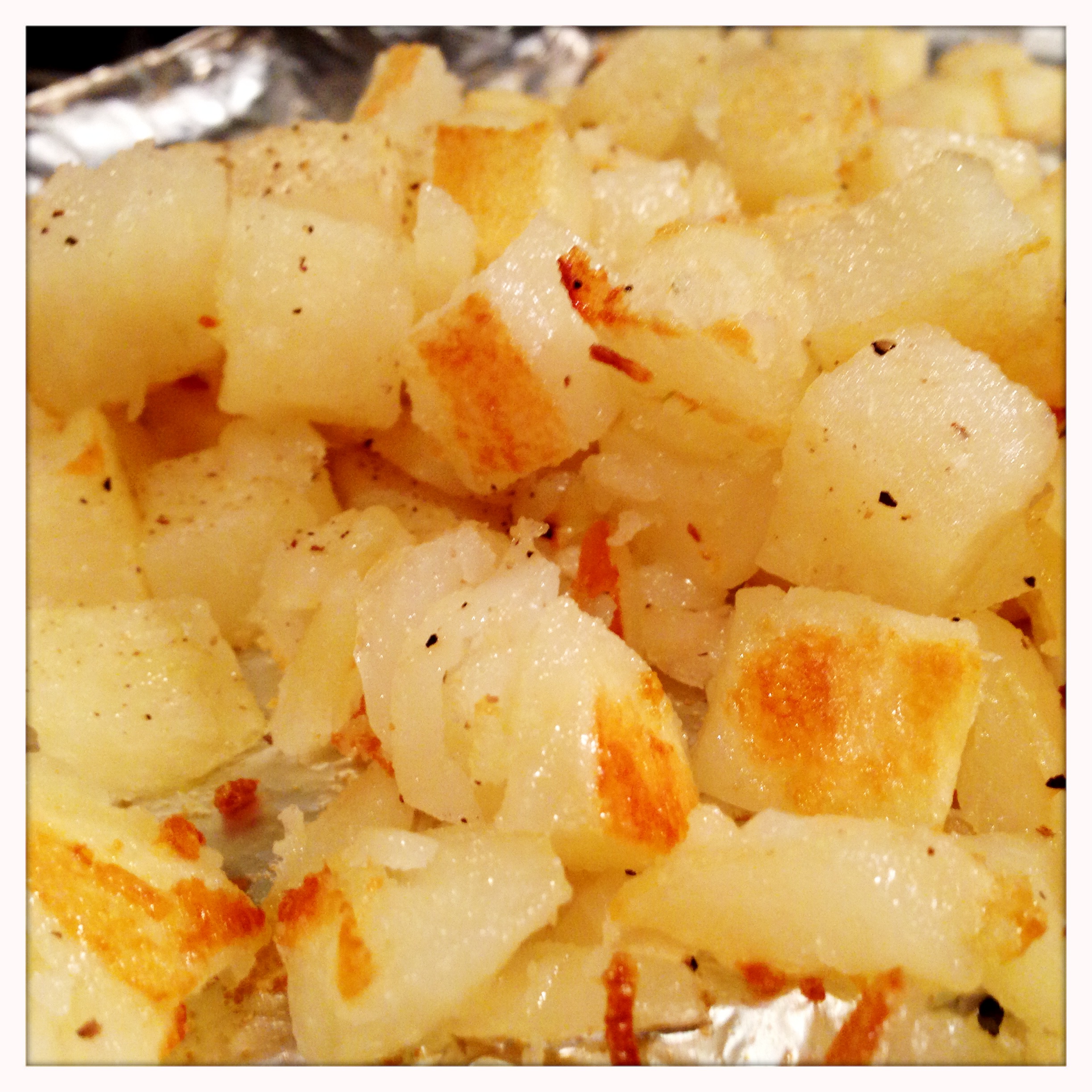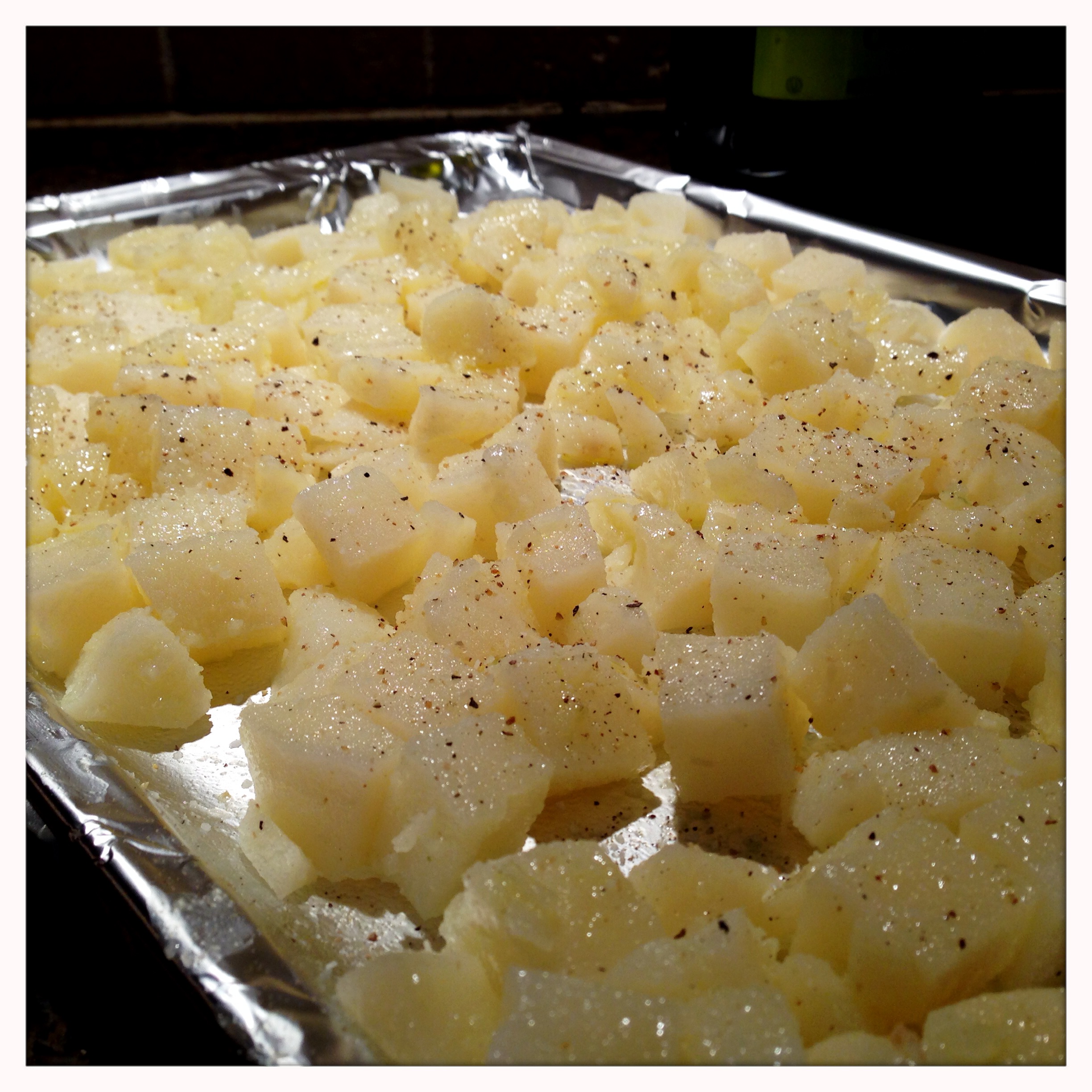 The longest part of this recipe is getting the potatoes roasted, so we will start with them and let them cook while we do the rest. Preheat your oven to 400 degrees. Peel and cube about a pound of potatoes. Place them in a zip top bag with a little olive oil and shake to coat the potatoes. Lightly season with salt and pepper and place in the oven. They will roast for about 30 minutes.