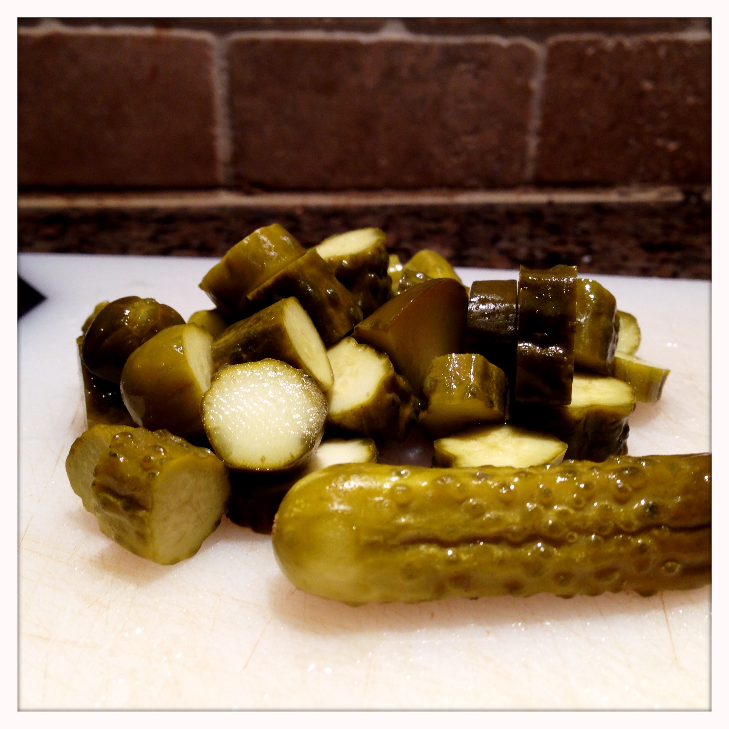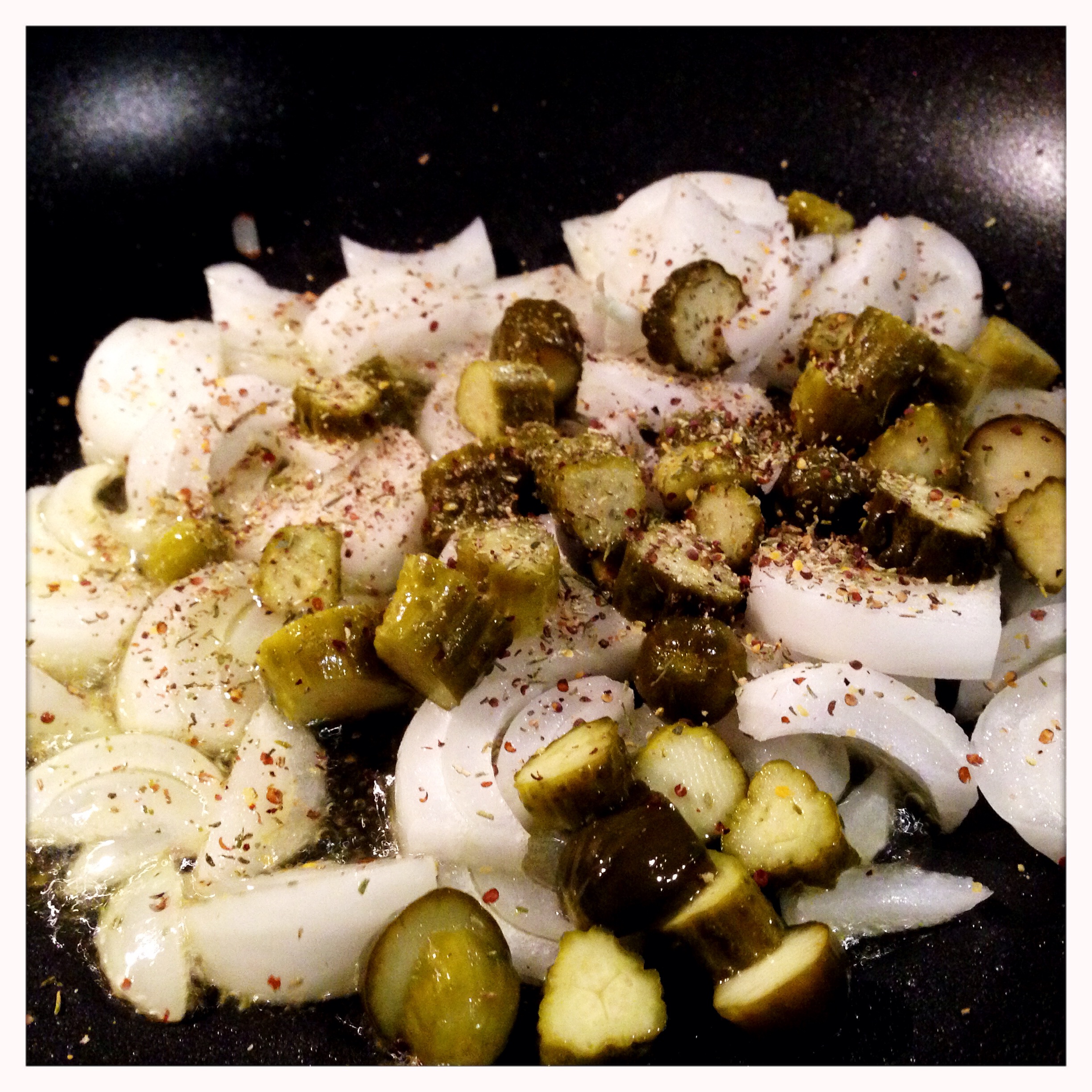After the pickles are chopped, slice up the onion and saute the pickles and onion in olive oil. Season with a little salt, pepper and herb blend.