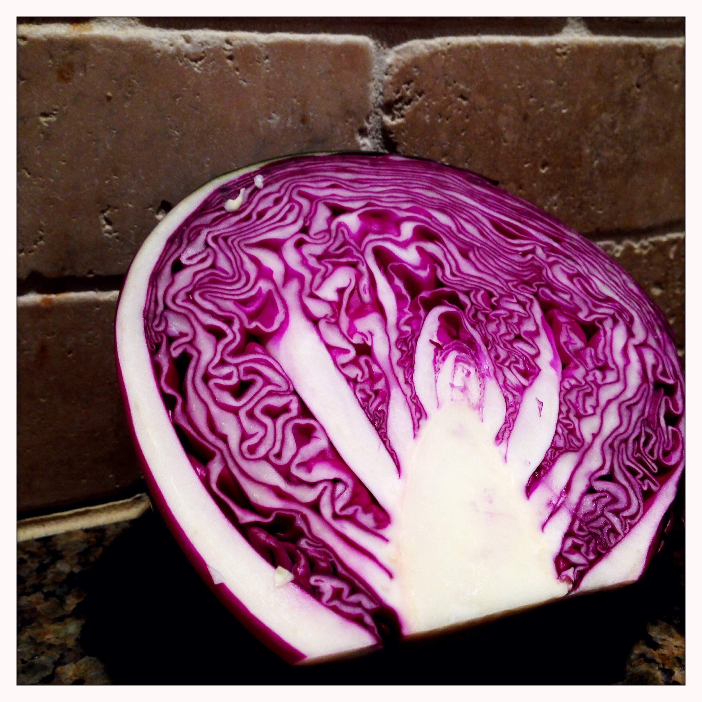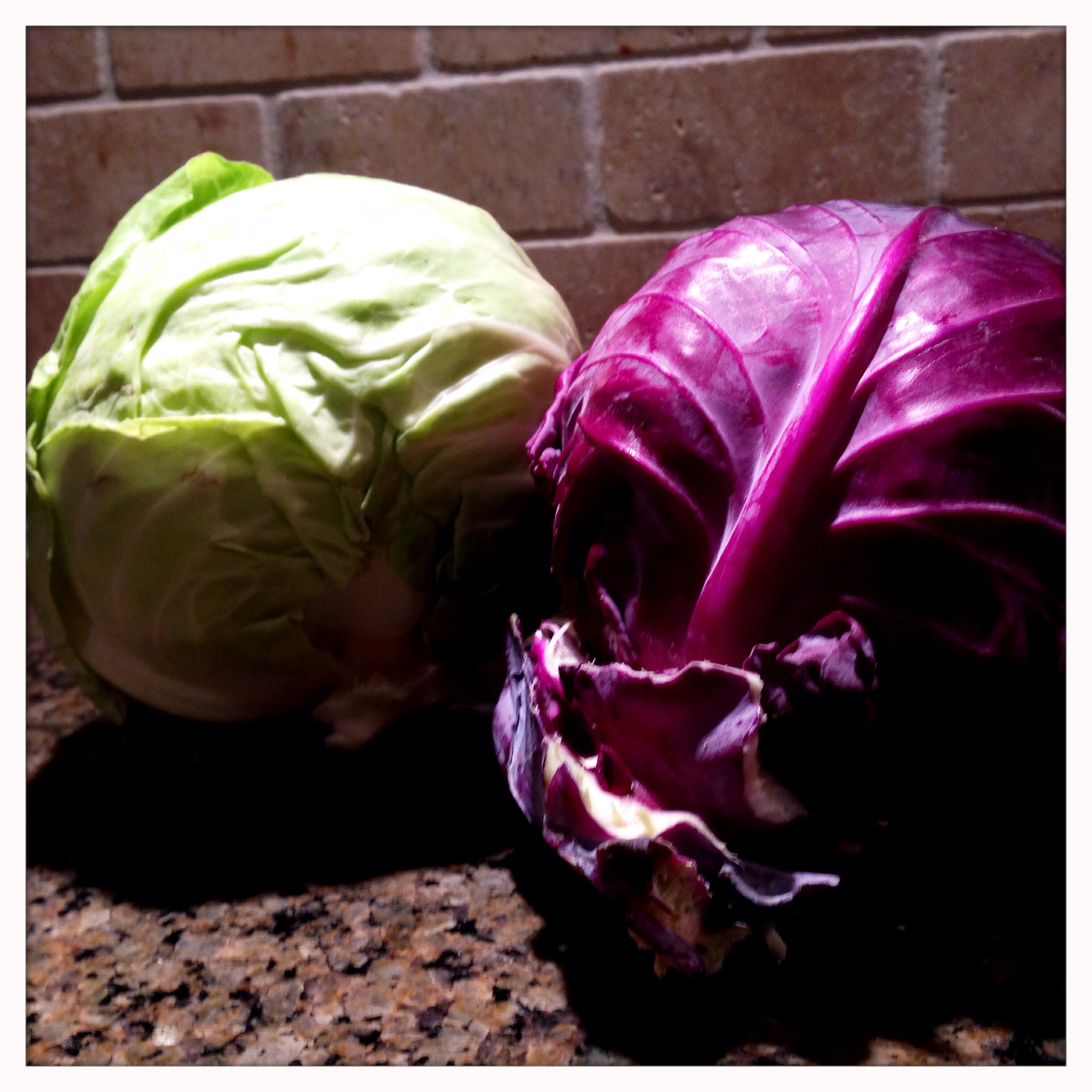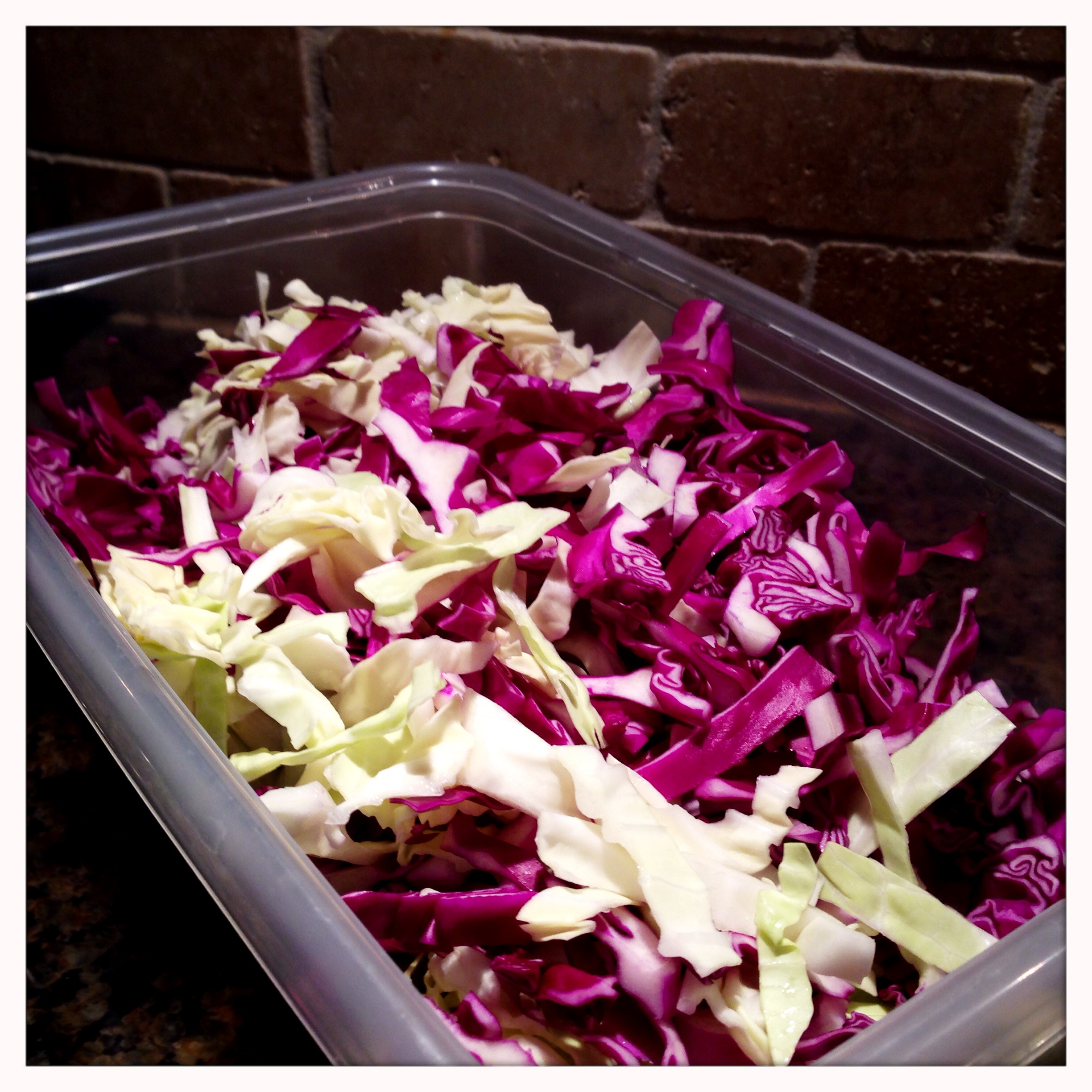 The primary reason for the two types of cabbage is for color. Feel free to use just one type if you prefer, but I like the look of the combination. To prep the cabbage, cut the heads in half.