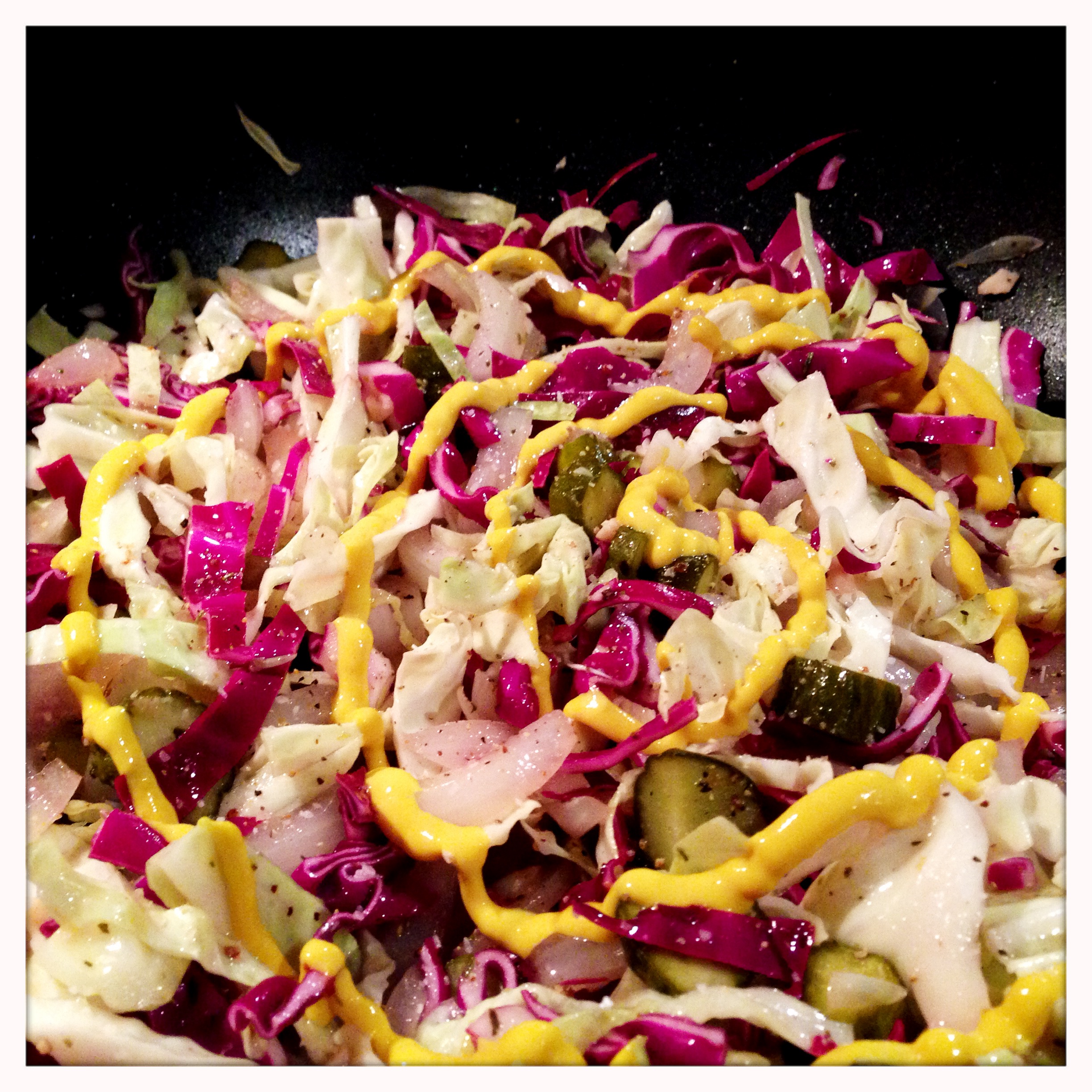 Once the onion and pickles have cooked for a few minutes, add the garlic and saute for another 1-2 minutes. Then add the cabbage. You may want to add the cabbage in batches depending on the size of your pan. It will cook down quickly as it wilts and make more space for additional cabbage. Along with the cabbage, add the apple cider vinegar, apple cider and one “spiral” of mustard.
