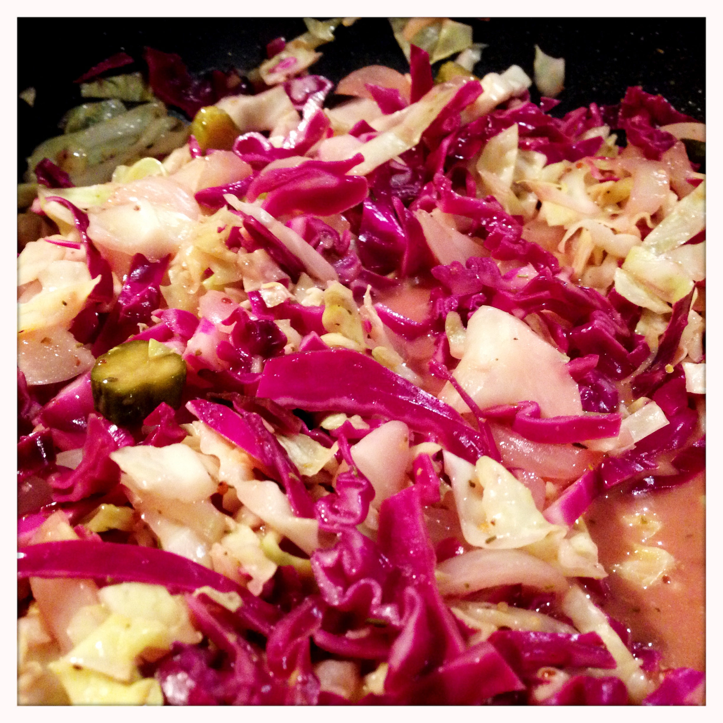 While the potatoes are roasting, we will make the cabbage. I chose a fairly savory style with only a hint of sweet as I find most red cabbage to be too sweet. This recipe combines red and green cabbage with onion, pickles and garlic cooked with vinegar, cider and mustard.