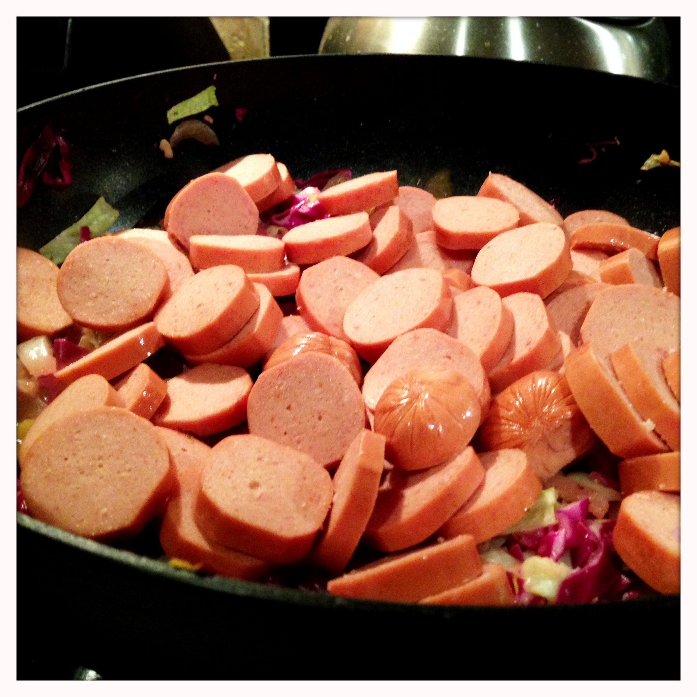 Once you’re happy with the cabbage, add the sausage to the pan. I like to place the sausage on top and cover so that the sausage steams for about 5 minutes.
