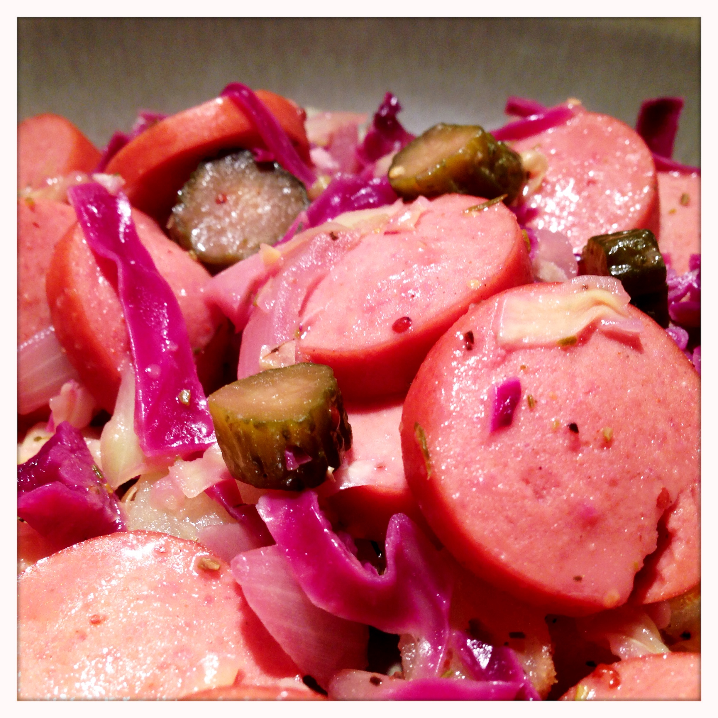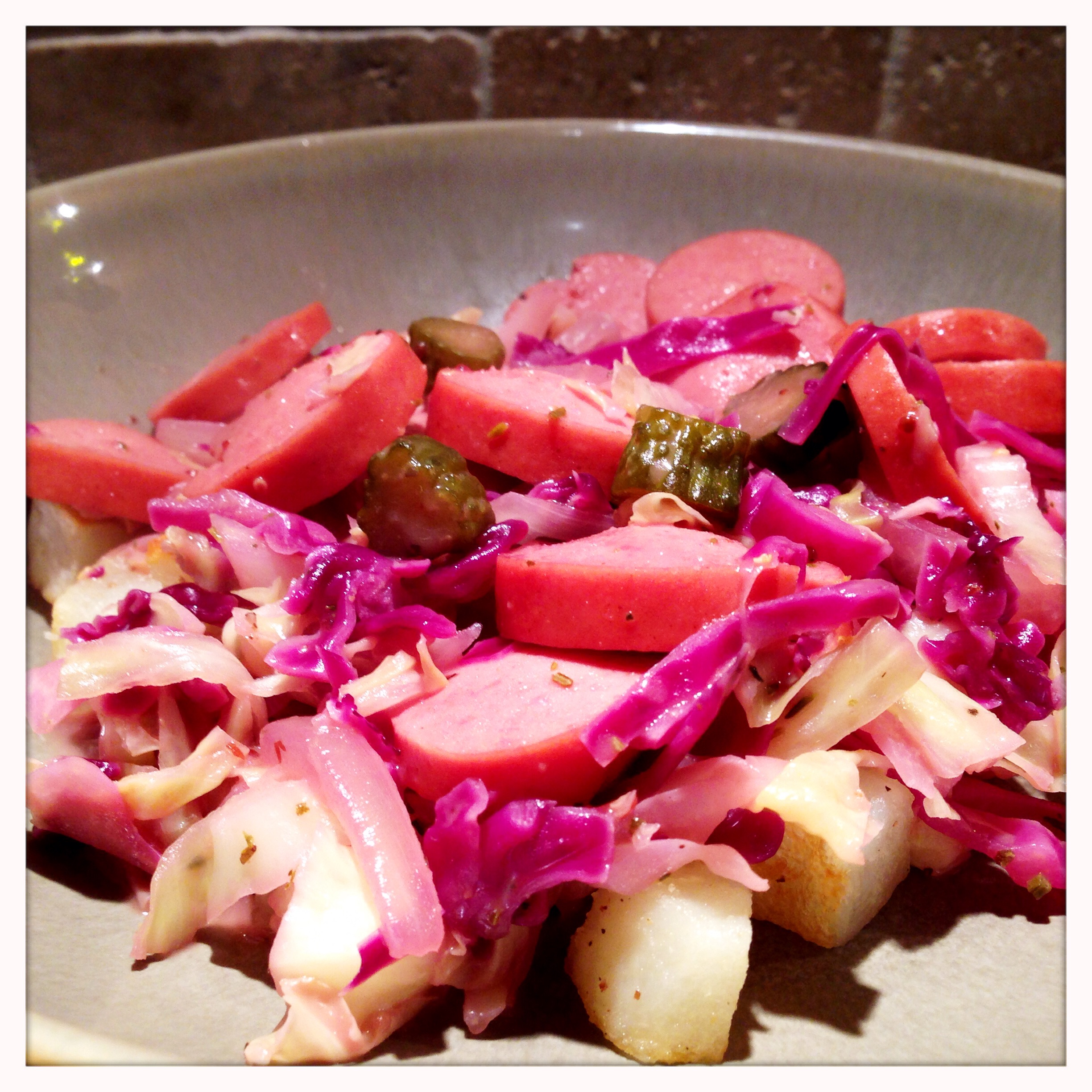 After the success of the red and green cabbage at Christmas, I decided to forego the jarred red cabbage component and make all of the cabbage from scratch. I added some roasted potatoes for heartiness and paired the whole thing with some knackwurst. Knackwurst is a great dinner sausage, something of a stubby, chubby, seasoned hot dog. If you can’t find them, a good weisswurst (which was what I intended to use, but couldn’t find), bratwurst or even a regular frankfurter will work well here.