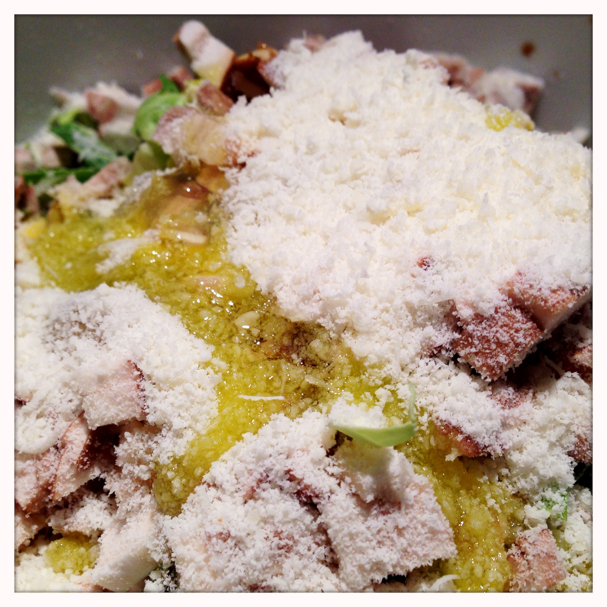 Then add the bread crumbs, parmesan cheese and a drizzle of olive oil.