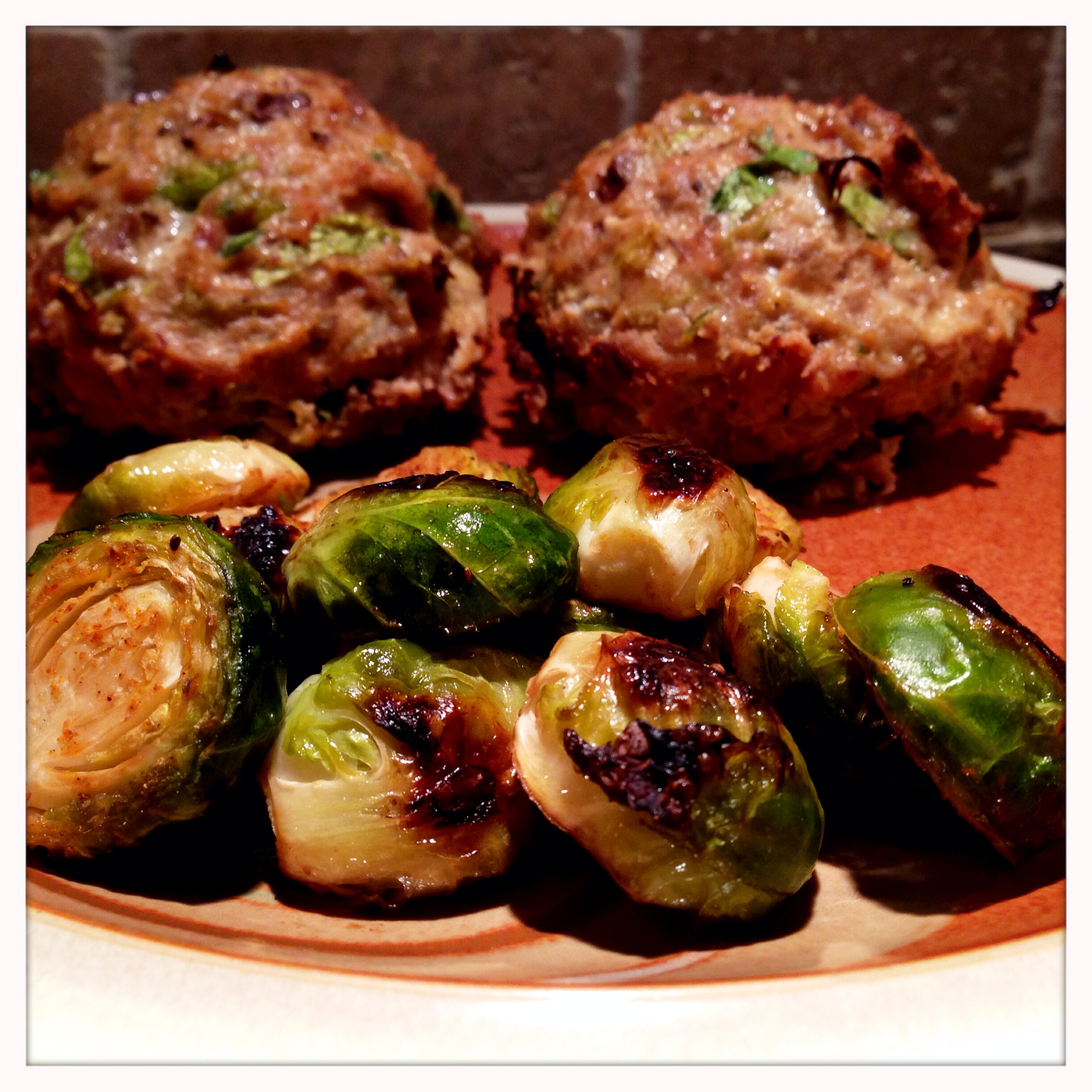 The sprouts inside the muffins end up steaming in the moisture from the meat and are flavored by the fat from the sausage. They come out tender and tasty, but have a different flavor profile than the caramelized, roasted sprouts. This keeps the flavors of muffins and the side dish complementary, but not redundant.