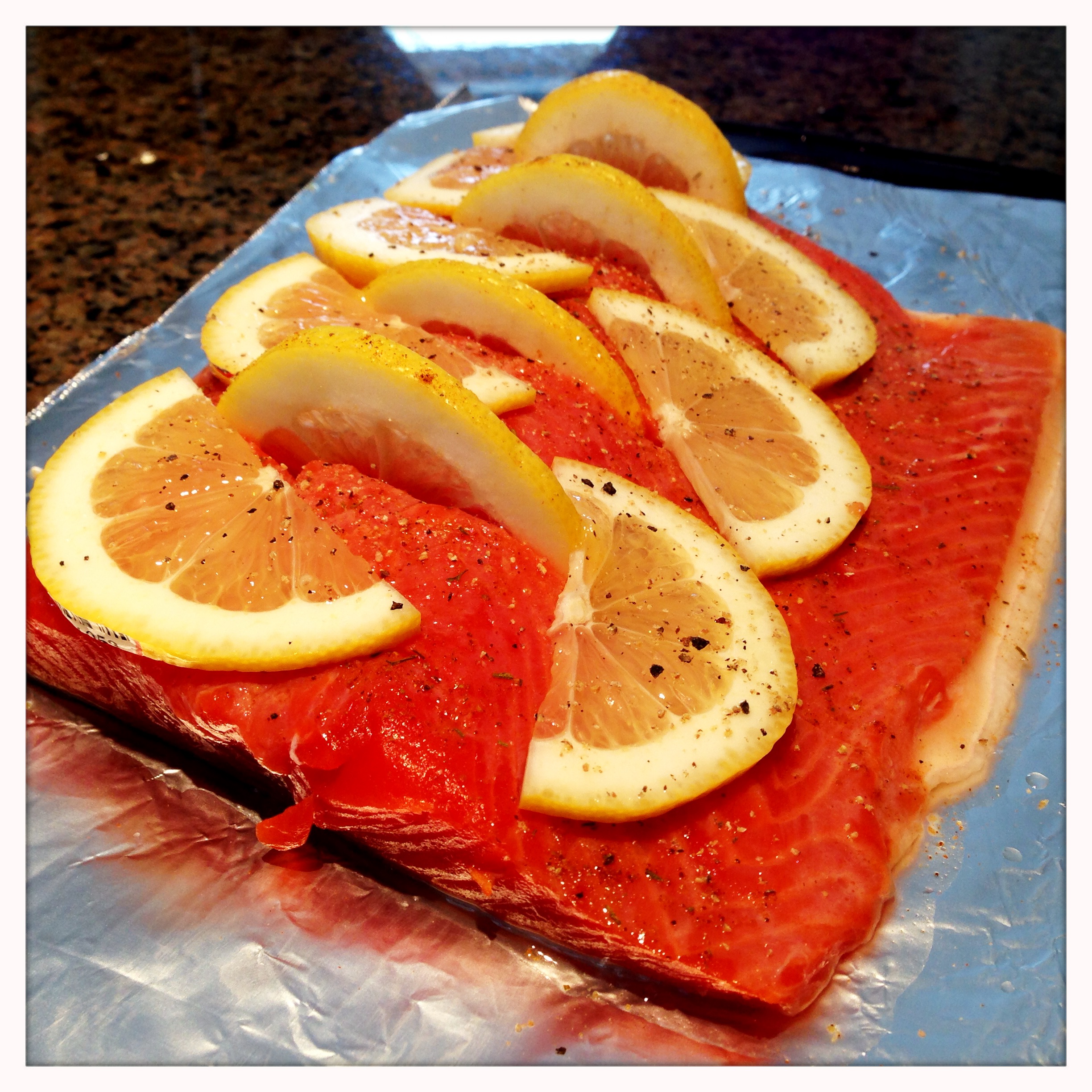 Insert a thin lemon slice into each slit. Cover the flesh of the fish with the fresh squeezed lemon juice. Season the fish with the chesapeake bay seasoning and some black pepper. Be careful not to over-season the fish. You want to add some flavor to augment the salmon’s natural taste, not to hide it. Finally, place more lemon slices over the fish.