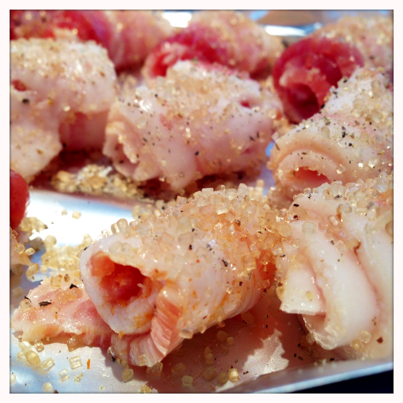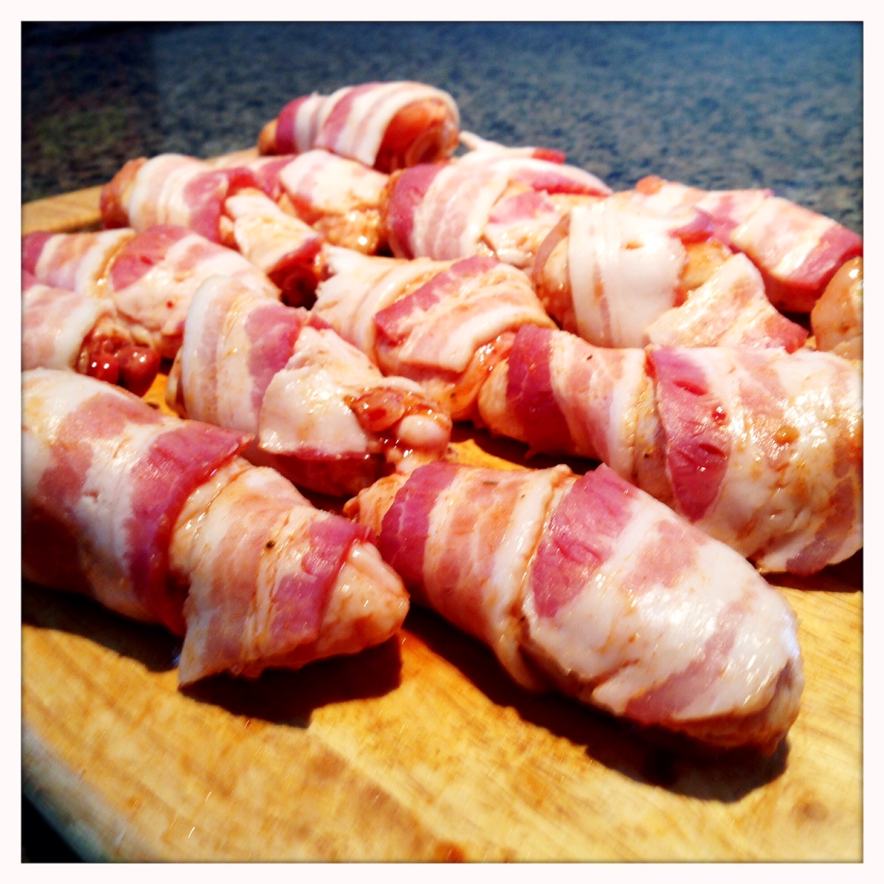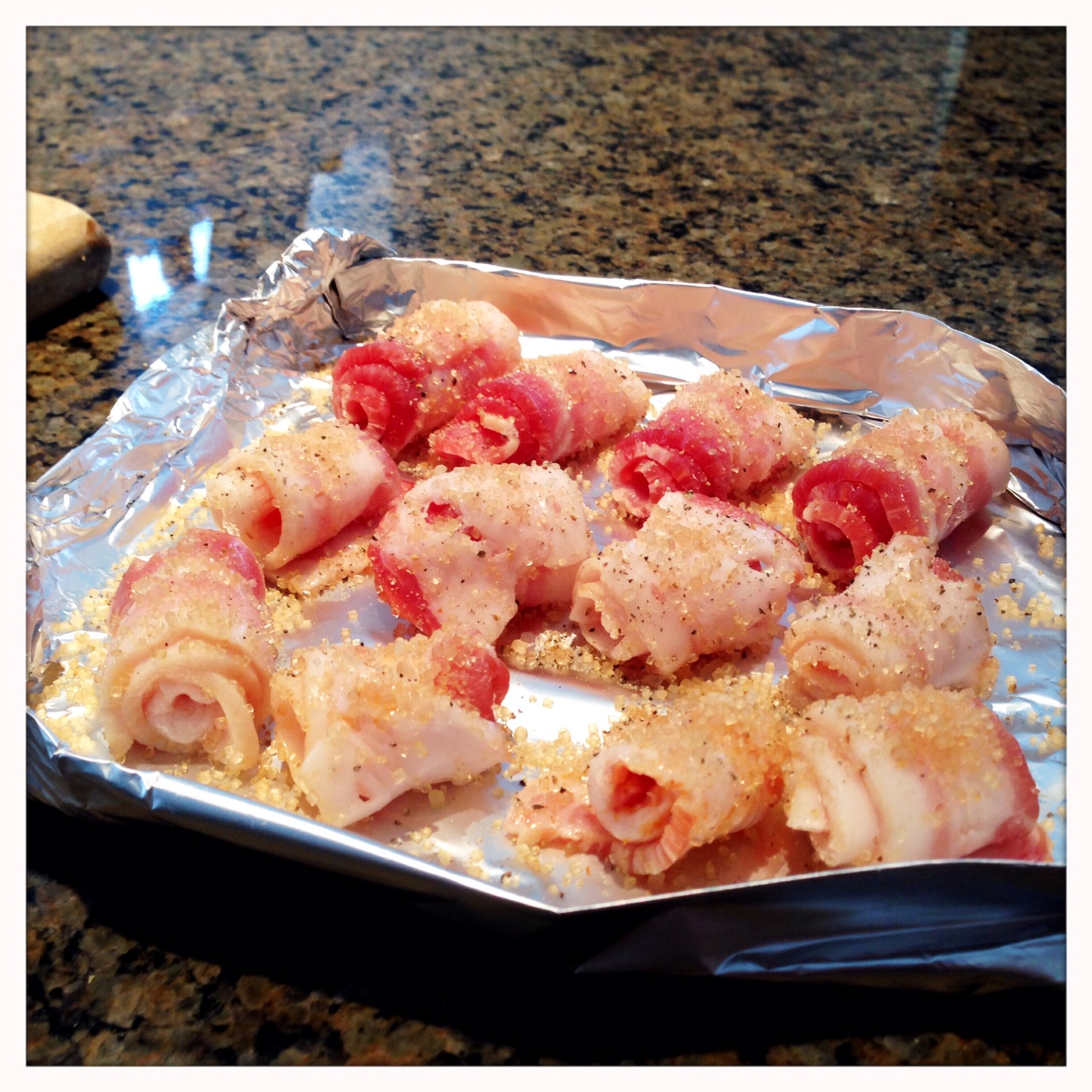 I cut each slice into thirds, and rolled the small pieces of bacon into small rolls. I cut each roll in half and placed them onto a small makeshift cooking sheet made out of foil.