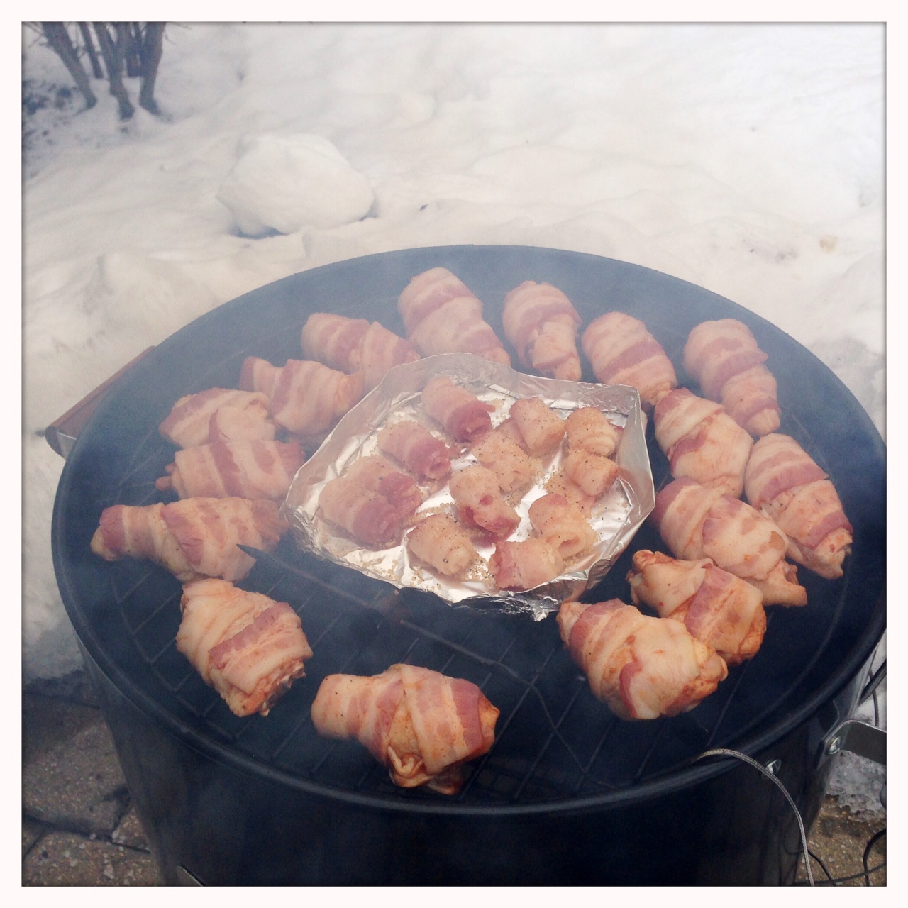 I covered the smoker and let everything cook (without peeking!) at 275 for about 75-90 minutes. When I pulled everything off, the bacon pieces wrapped around the wings were crisp, but not charred.