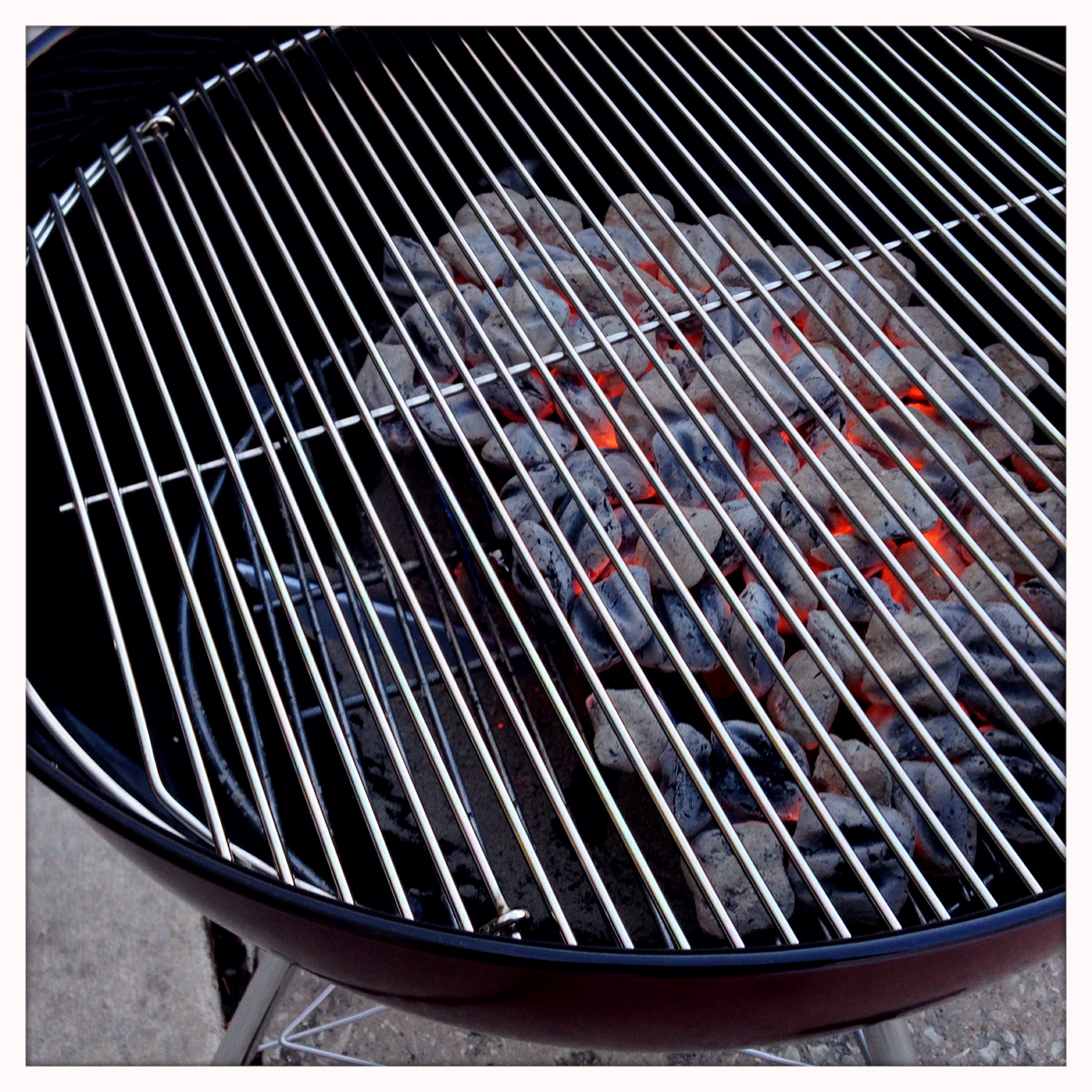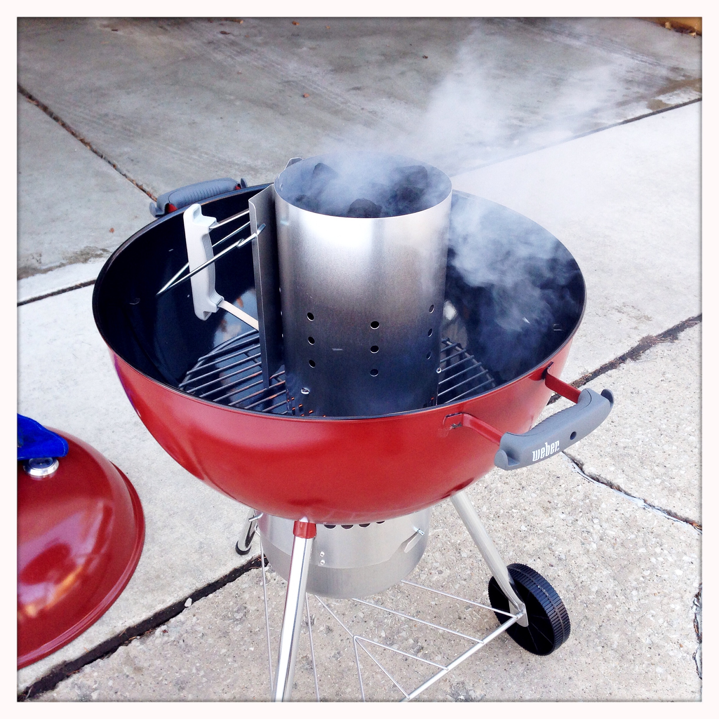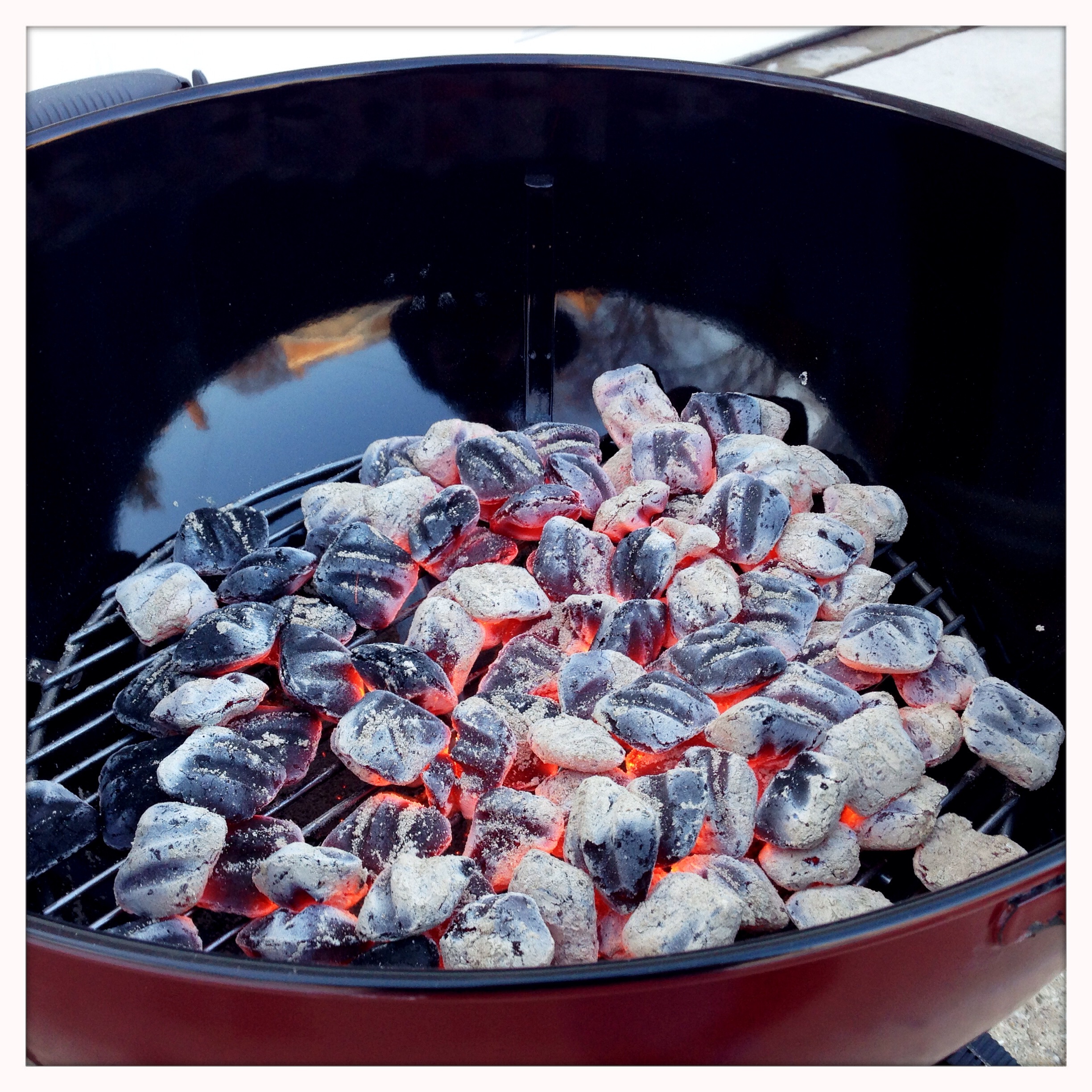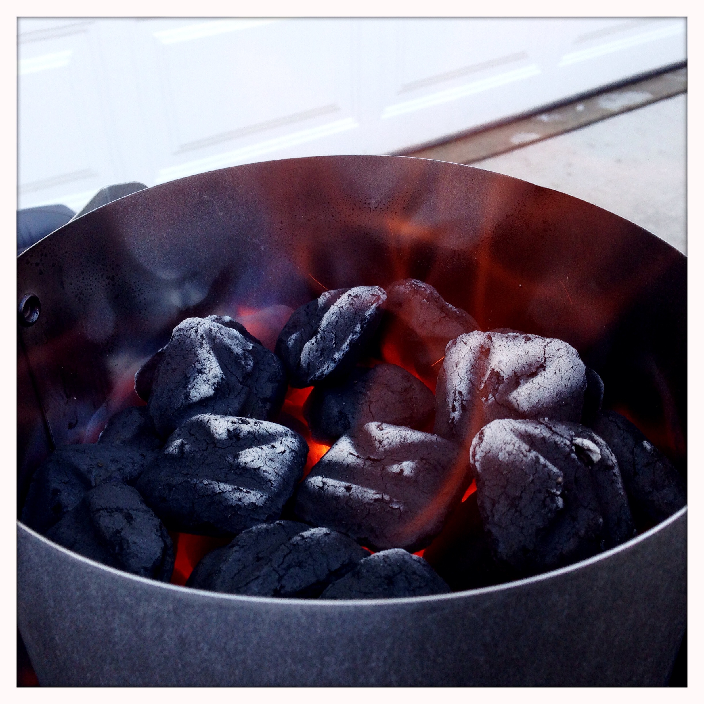 The coals in the photo above are just about ready. I am using 100% natural hardwood charcoal. This is close to lump charcoal in that there are no chemicals added, but it has the convenience and uniformity of a briquette. Once the flames reach the top and the top coals start to ash over, dump the coals onto the charcoal grate, and distribute them evenly. For smokier flavor, add a chunk of smoking wood (or some presoaked wood chips) at this point as well.